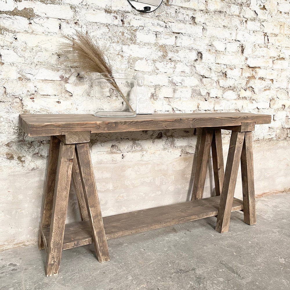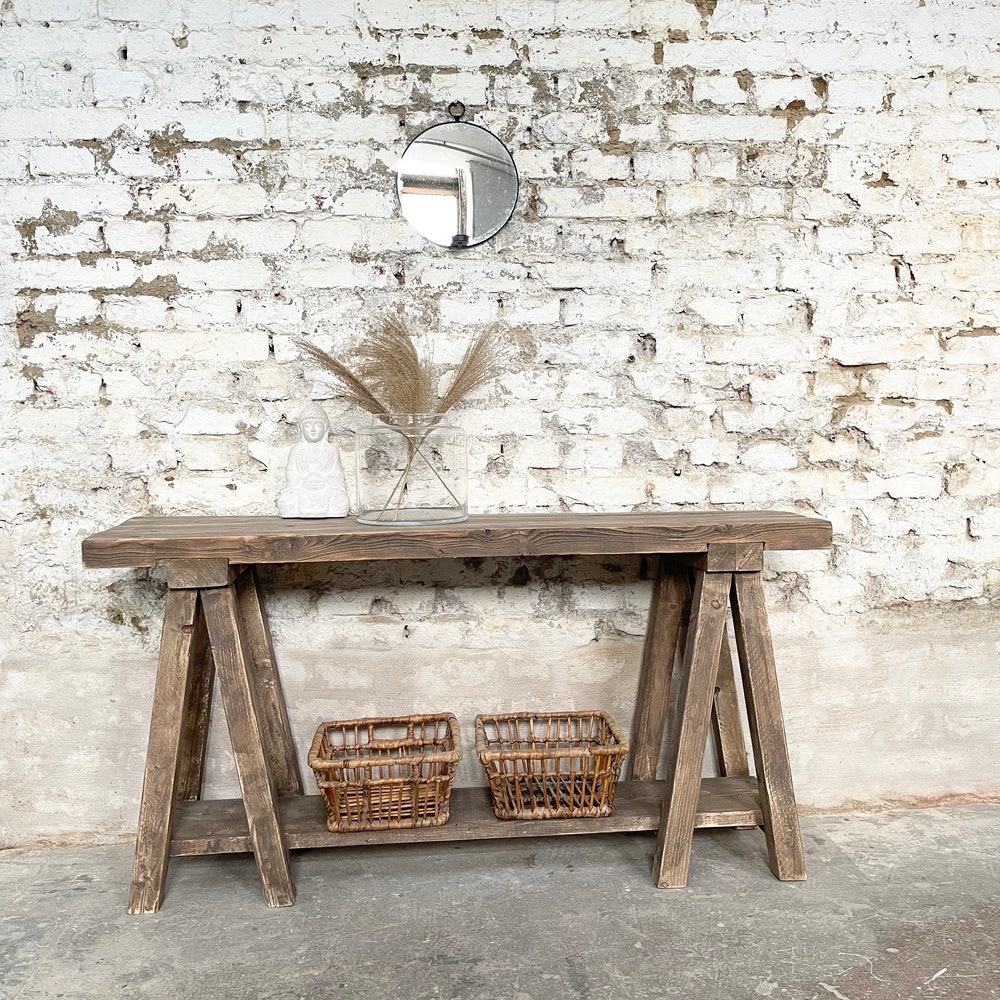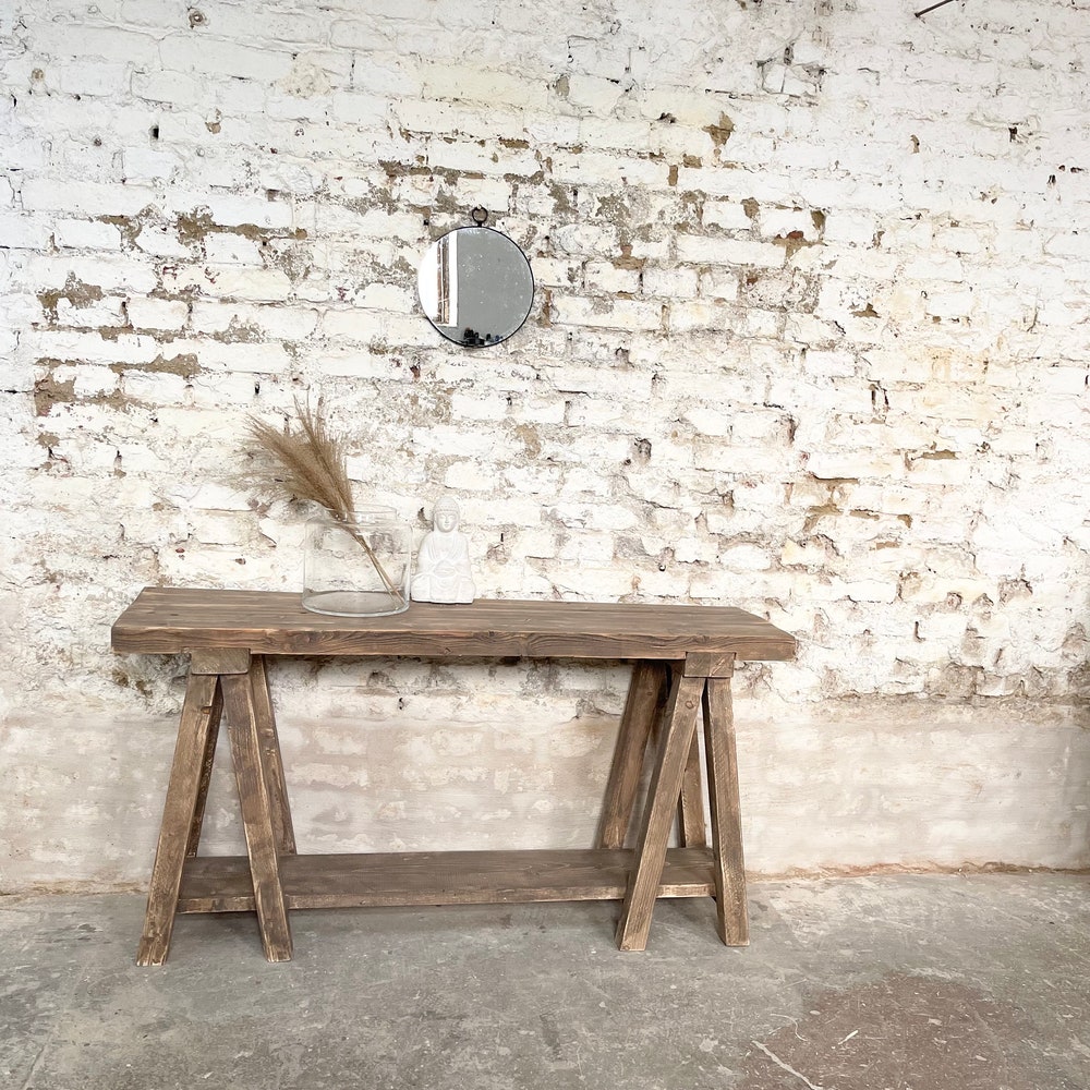 Console table, high table, perfect behind the sofa or in the entrance area. Made from solid reclaimed wood (spruce) in a rustic vintage look. The surface is sealed with natural materials (wax) and thus also provides good protection against stains. If you would like a custom-sized console, please feel free to contact us. Each piece […]