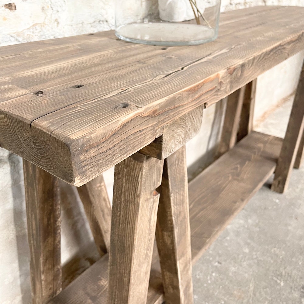 Console table, high table, perfect behind the sofa or in the entrance area. Made from solid reclaimed wood (spruce) in a rustic vintage look. The surface is sealed with natural materials (wax) and thus also provides good protection against stains.