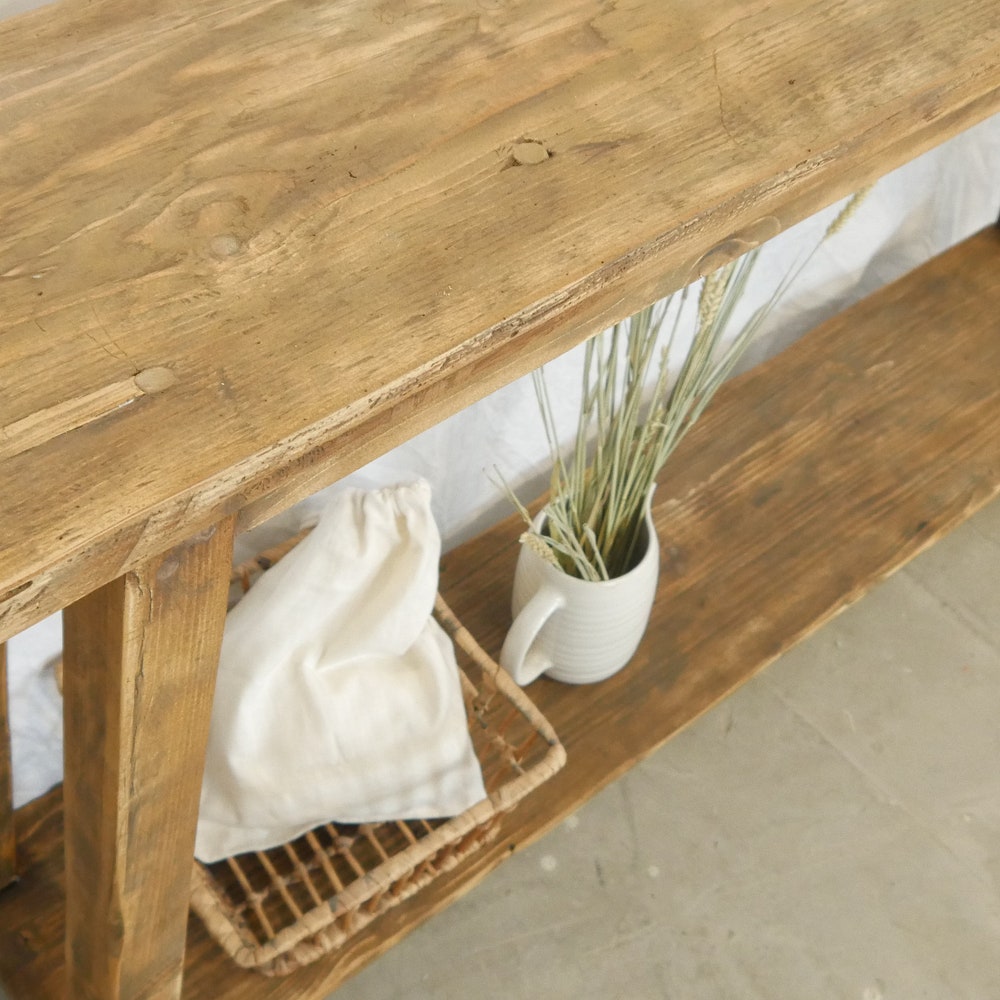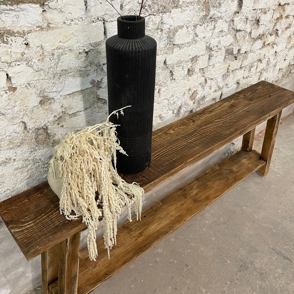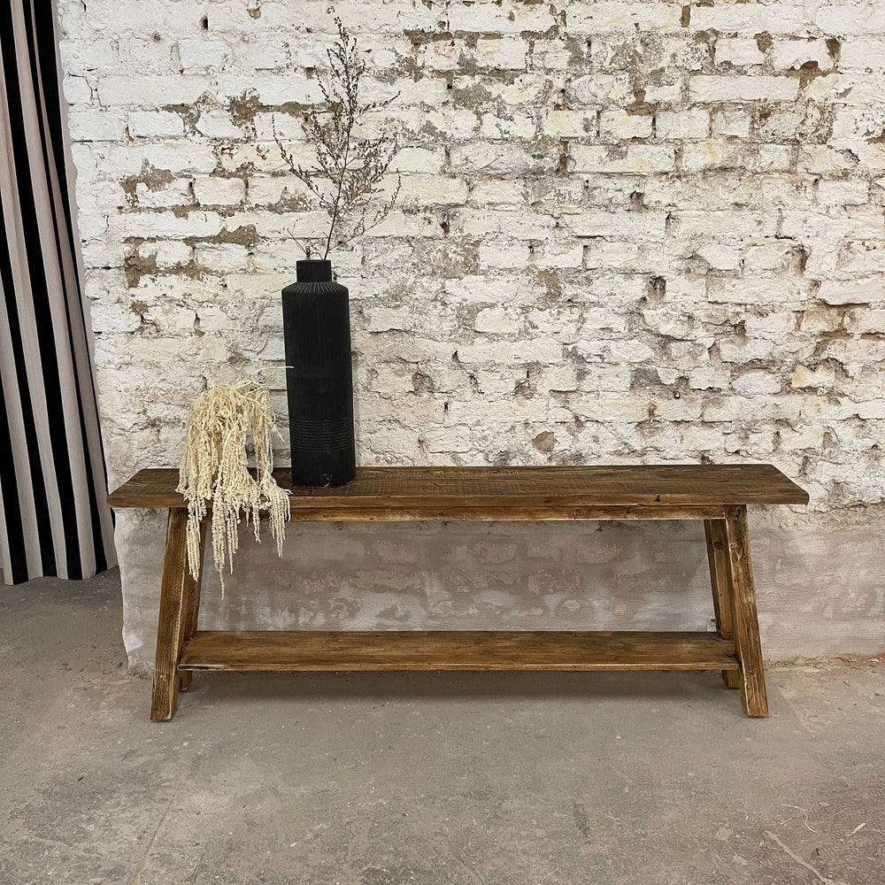 Adorable console with reclaimed wood surface – each piece is unique! The bench is usually 70 cm high (but can also be customized) and 20-25 cm wide, with a compartment to place shoes, decorations, etc. The console in the photos is 180 cm long.