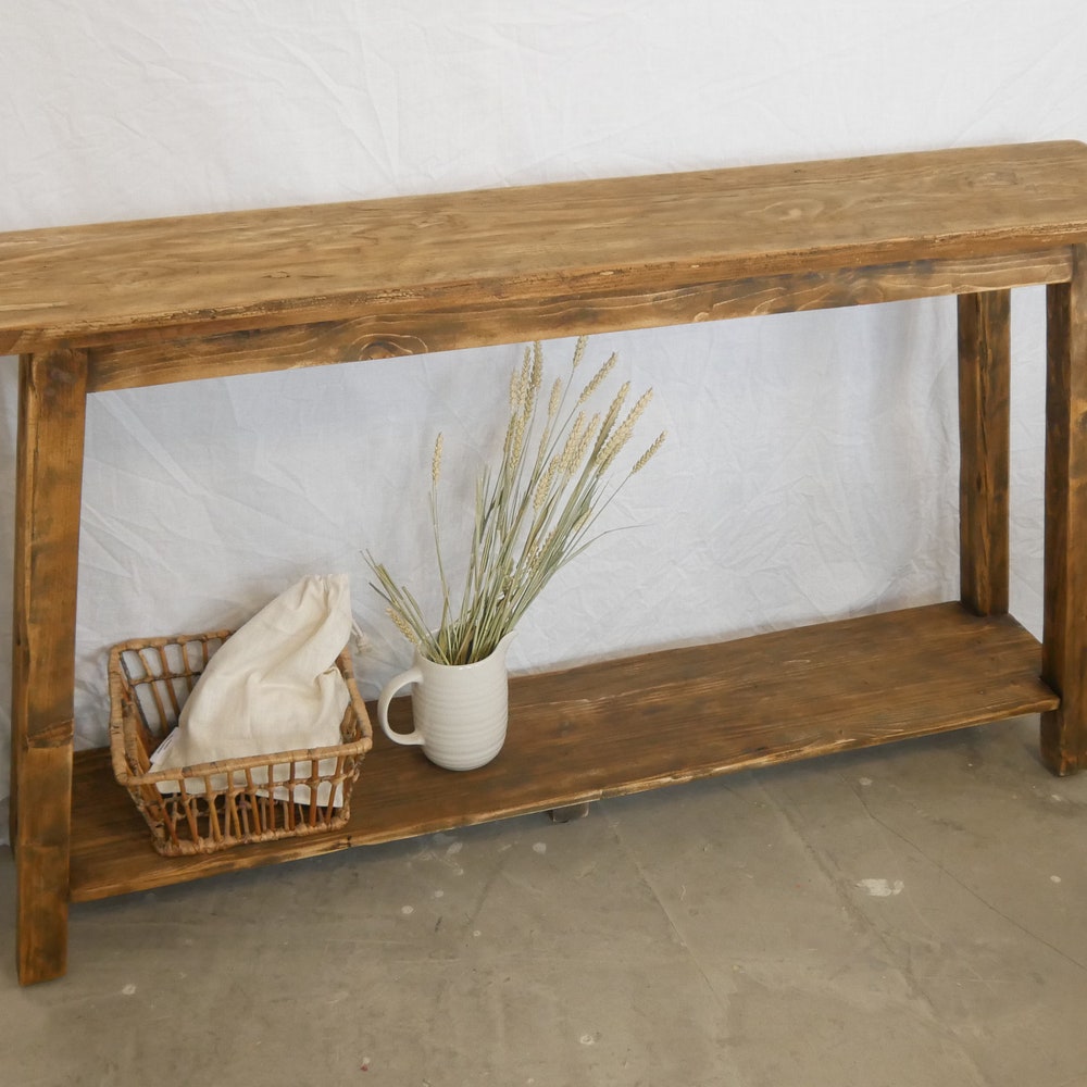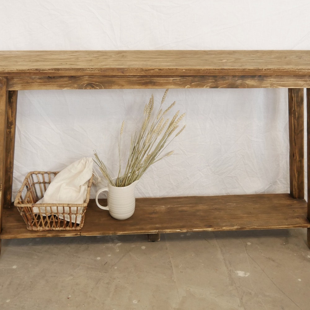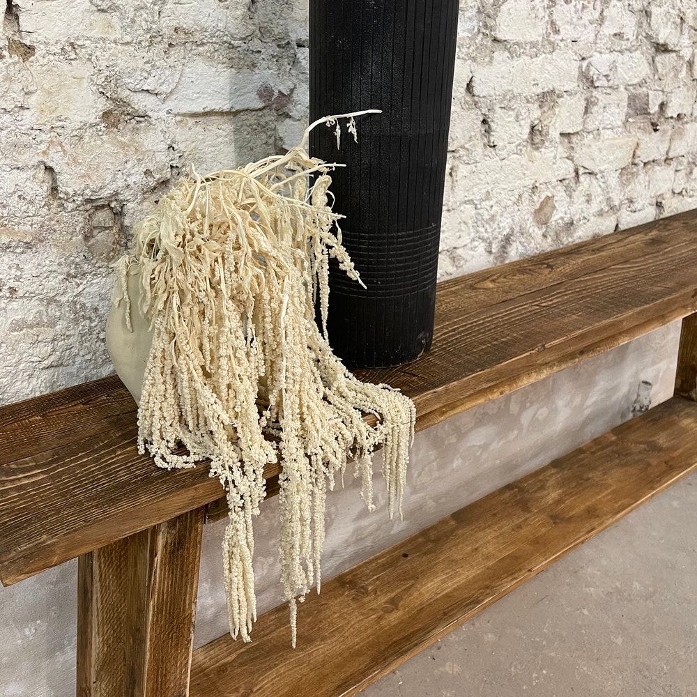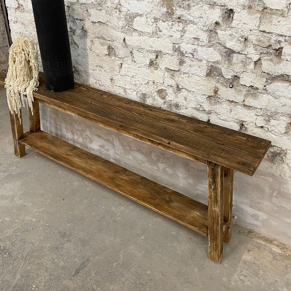 Adorable console with reclaimed wood surface – each piece is unique! The bench is usually 70 cm high (but can also be customized) and 20-25 cm wide, with a compartment to place shoes, decorations, etc. The console in the photos is 180 cm long.