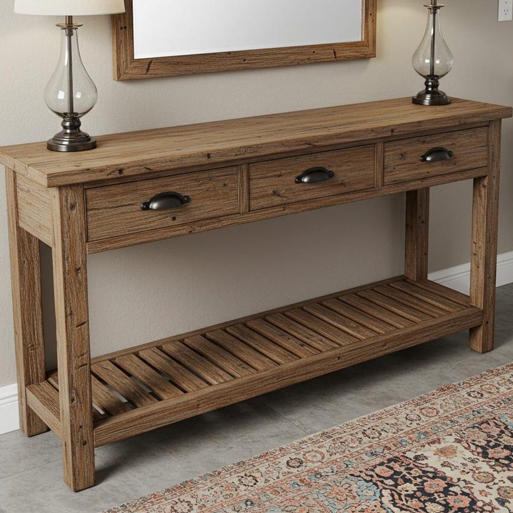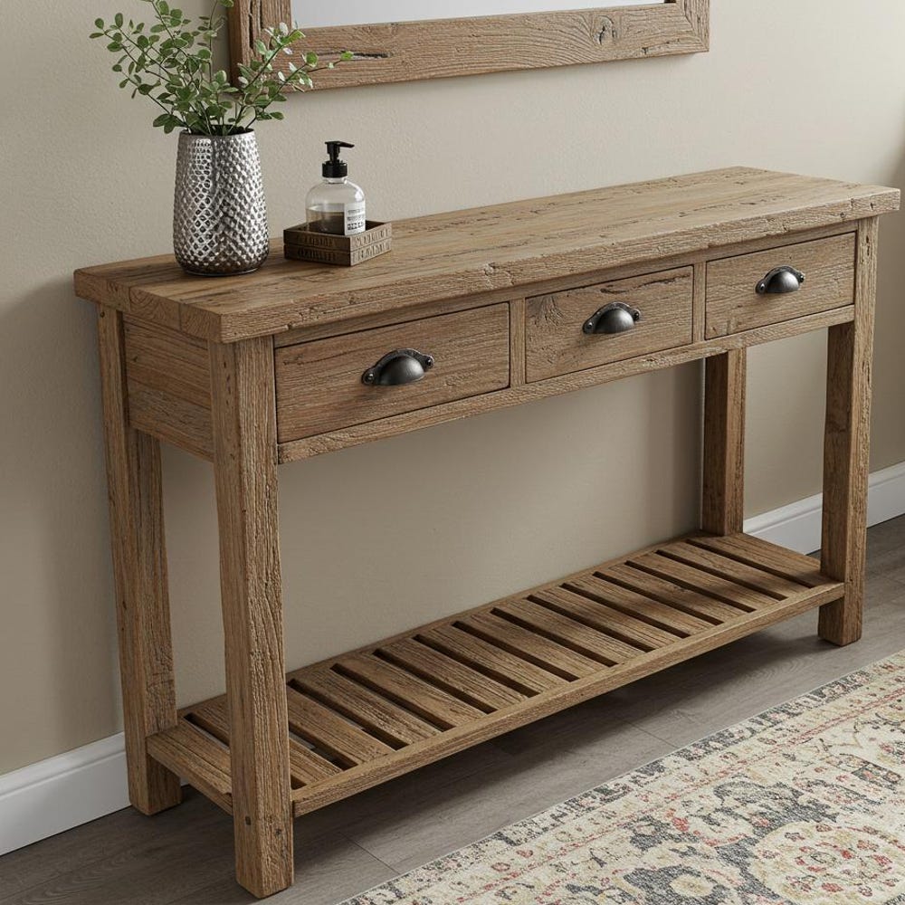 Handcrafted from genuine reclaimed wood, this console table brings rustic charm to any space. Each piece tells its own story through unique grain patterns, knots, and natural character marks that only authentic aged wood possesses.The practical lower shelf provides extra storage for books, baskets, or decorative items.