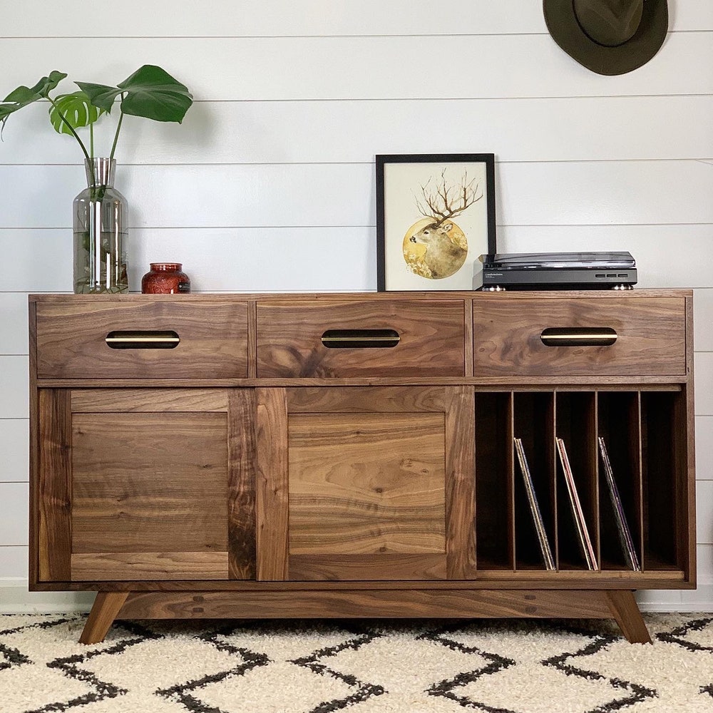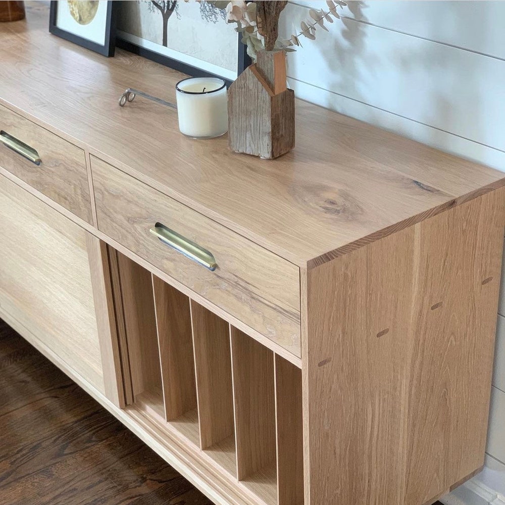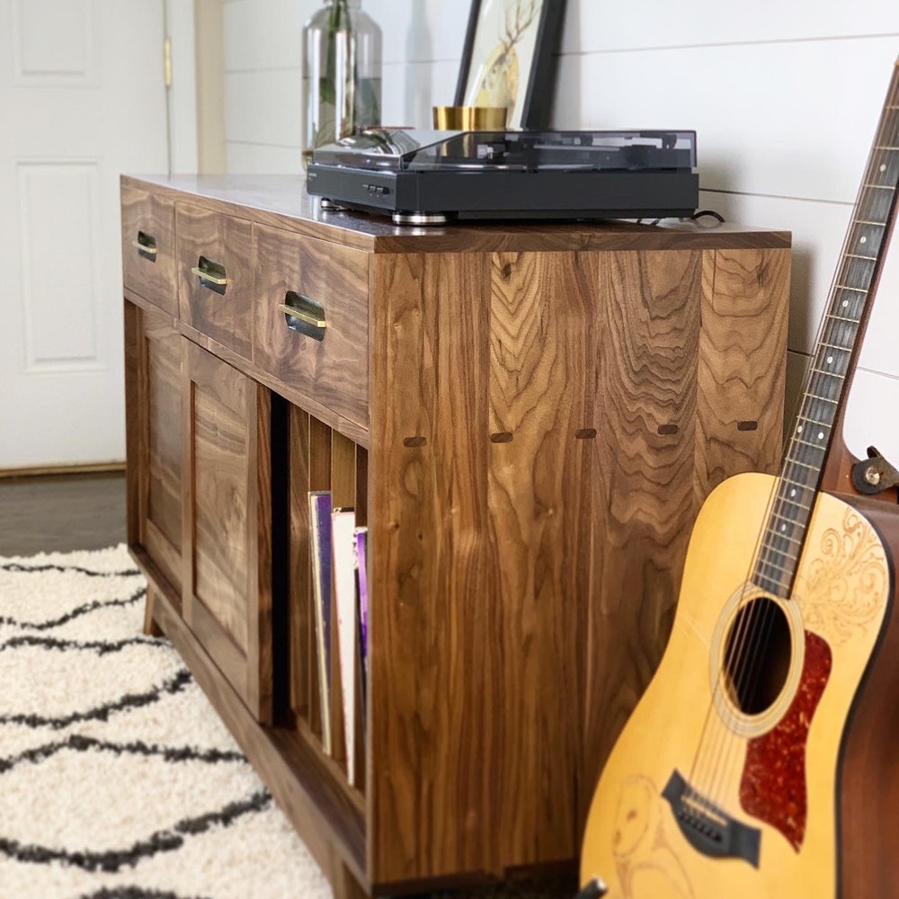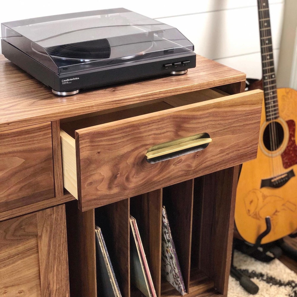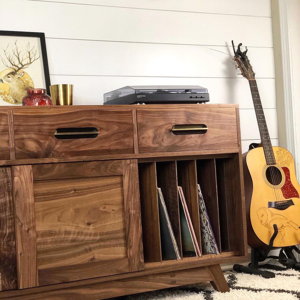 Features three drawers with custom made brass pulls ( or choose your own) , soft close/Undermount drawer slides. Two sliding doors with beautifully figured door fronts. Adjustable shelving and a section for your vinyl!
