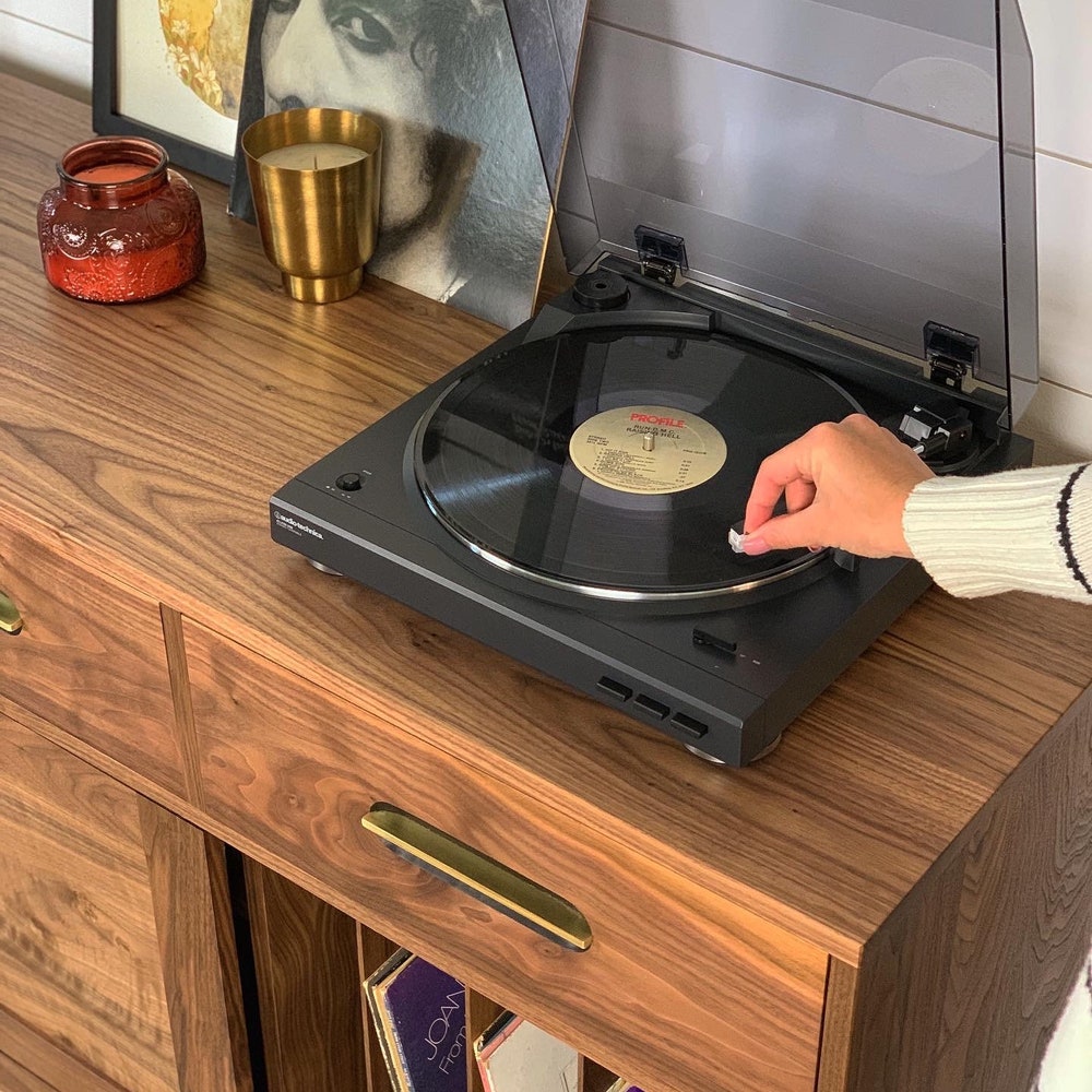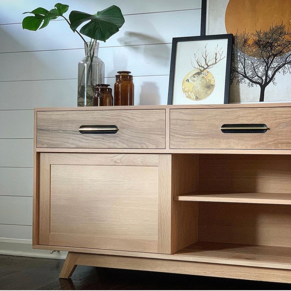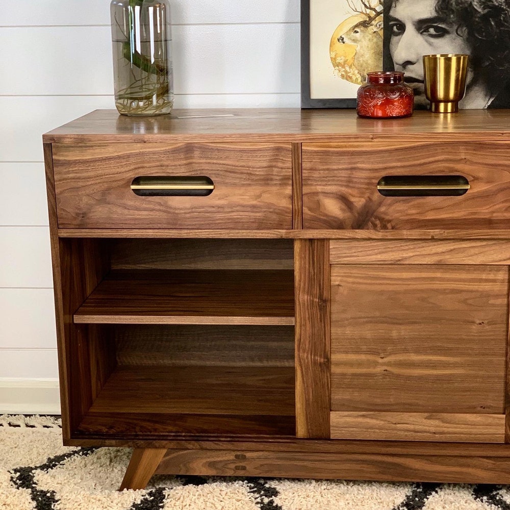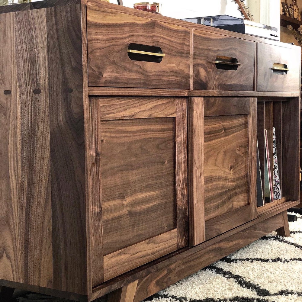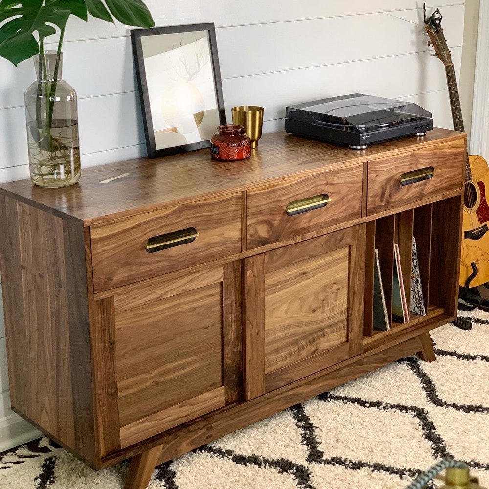Features three drawers with custom made brass pulls ( or choose your own) , soft close/Undermount drawer slides. Two sliding doors with beautifully figured door fronts. Adjustable shelving and a section for your vinyl!