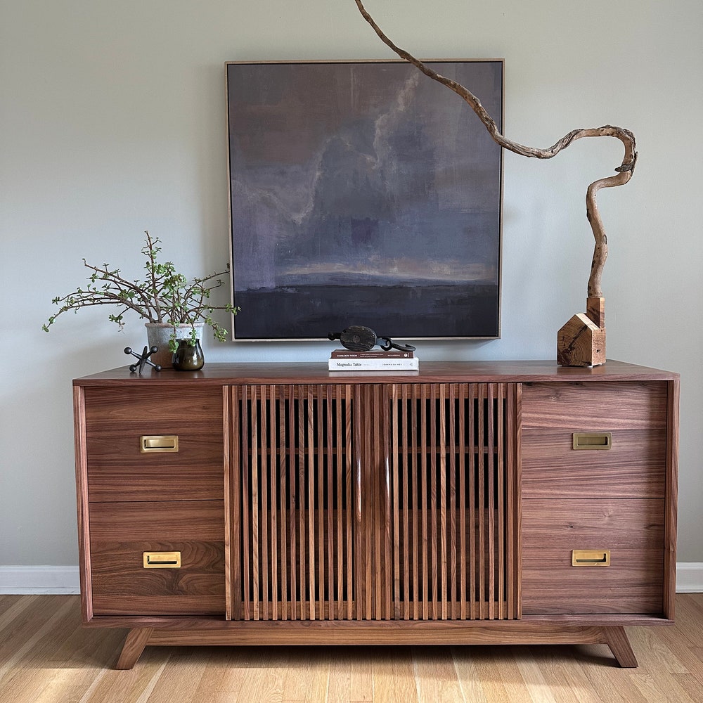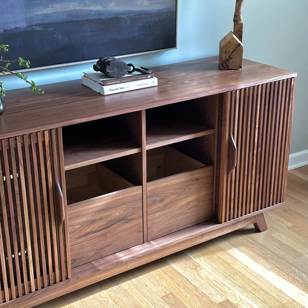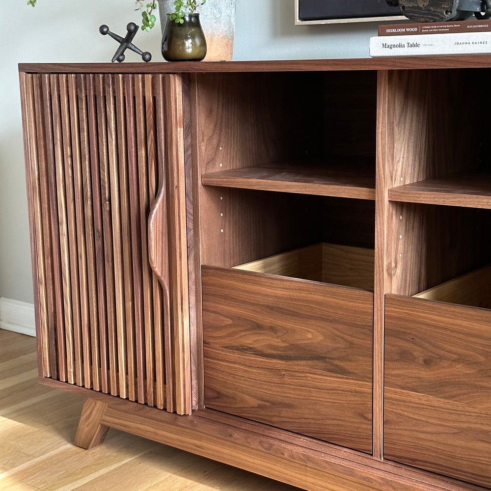Beautifully crafted, mid century modern inspired Record Cabinet. (Pictured in Walnut) Features 4 drawers for record storage with soft close under-mount drawer slides. One adjustable shelf above each of the four sections. Constructed of all solid hardwood. This cabinet is pictured in walnut, but is made to order in your choice of wood. The dimensions […]
