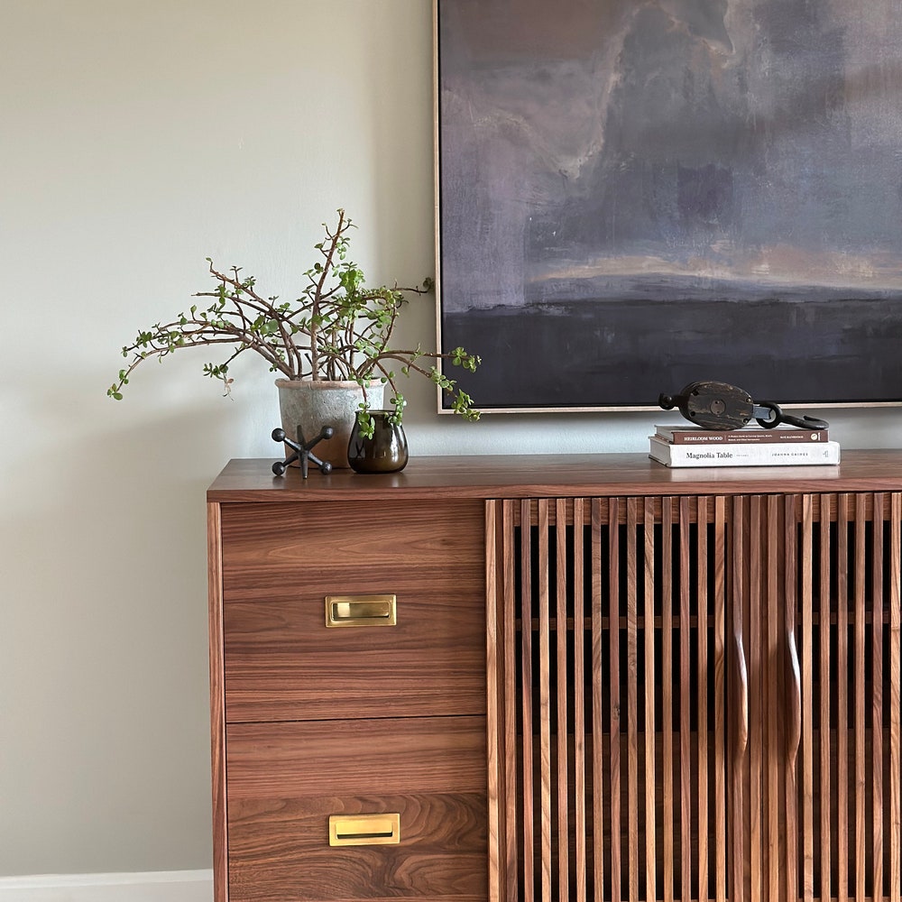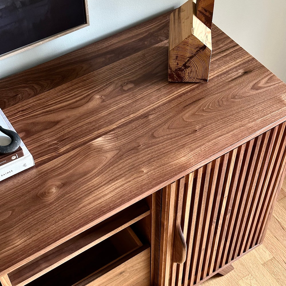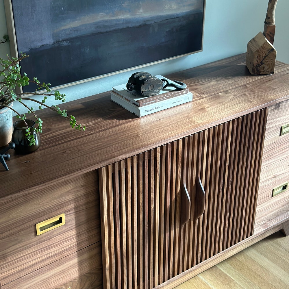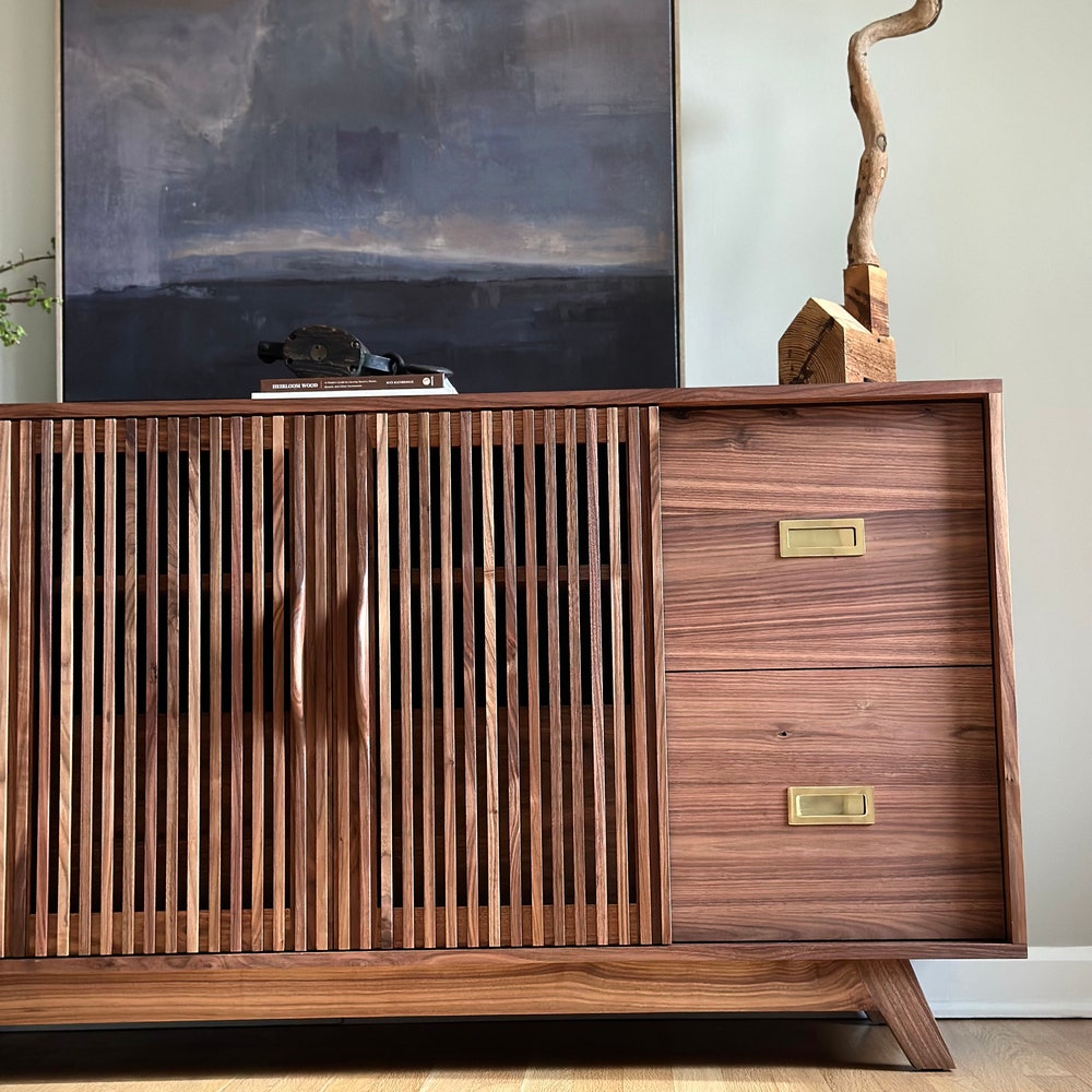 Beautifully crafted, mid century modern inspired Record Cabinet. (Pictured in Walnut) Features 4 drawers for record storage with soft close under-mount drawer slides. One adjustable shelf above each of the four sections. Constructed of all solid hardwood. This cabinet is pictured in walnut, but is made to order in your choice of wood. The dimensions […]