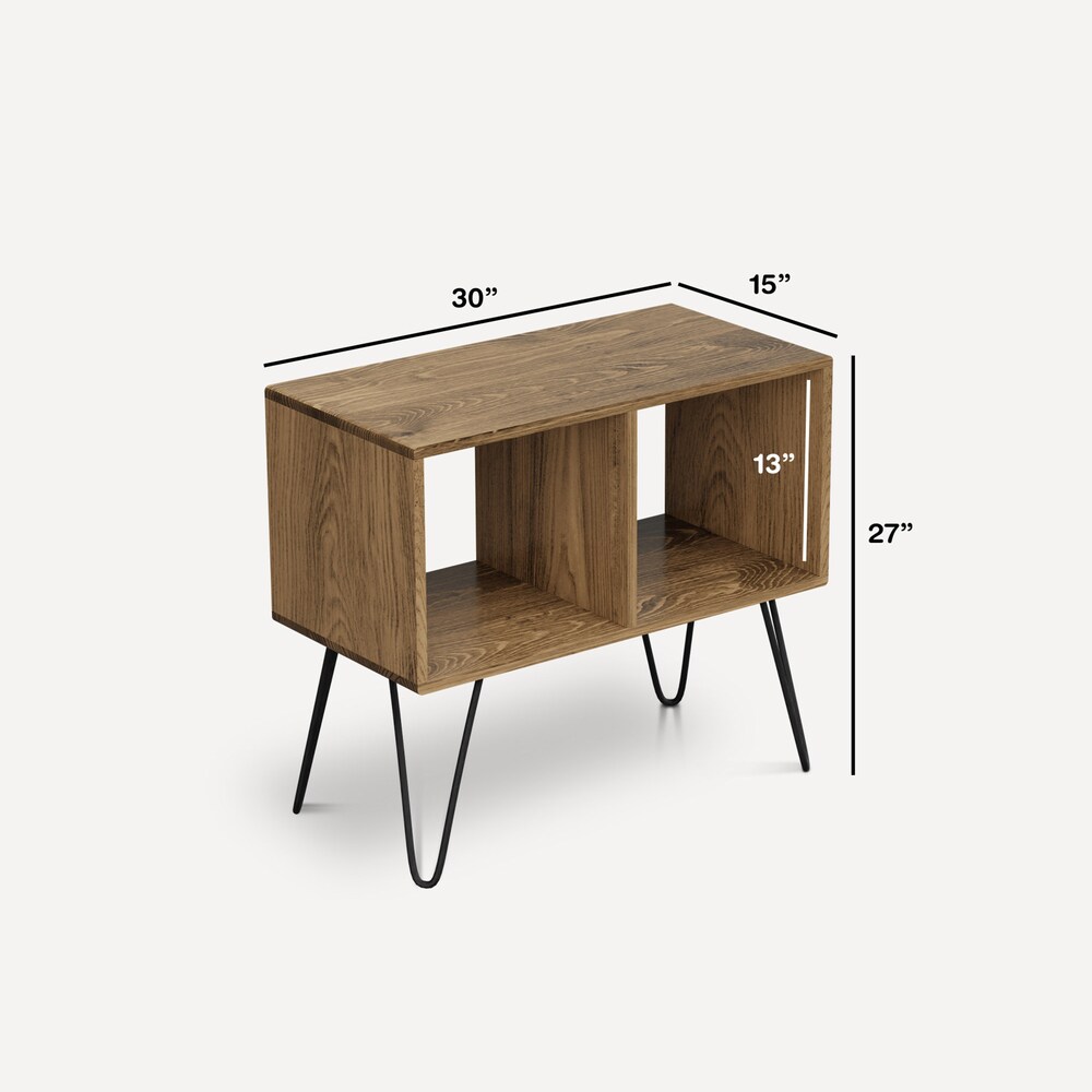 Put a new spin on Scandinavian style with this record console in a rich dark walnut finish. The darker cocoa hue brings out the beauty of the grain especially when set against a striking silver record player and steel hairpin legs.