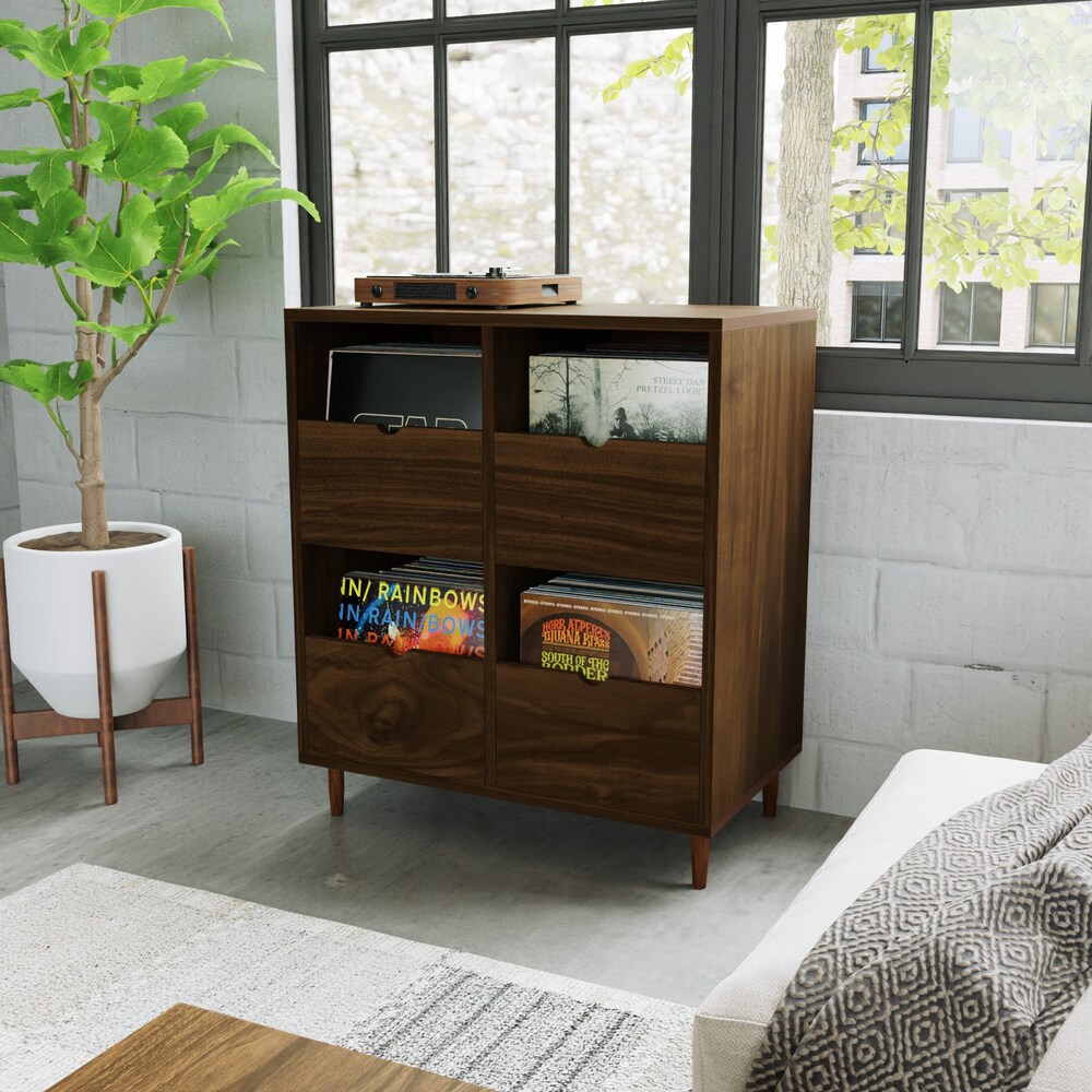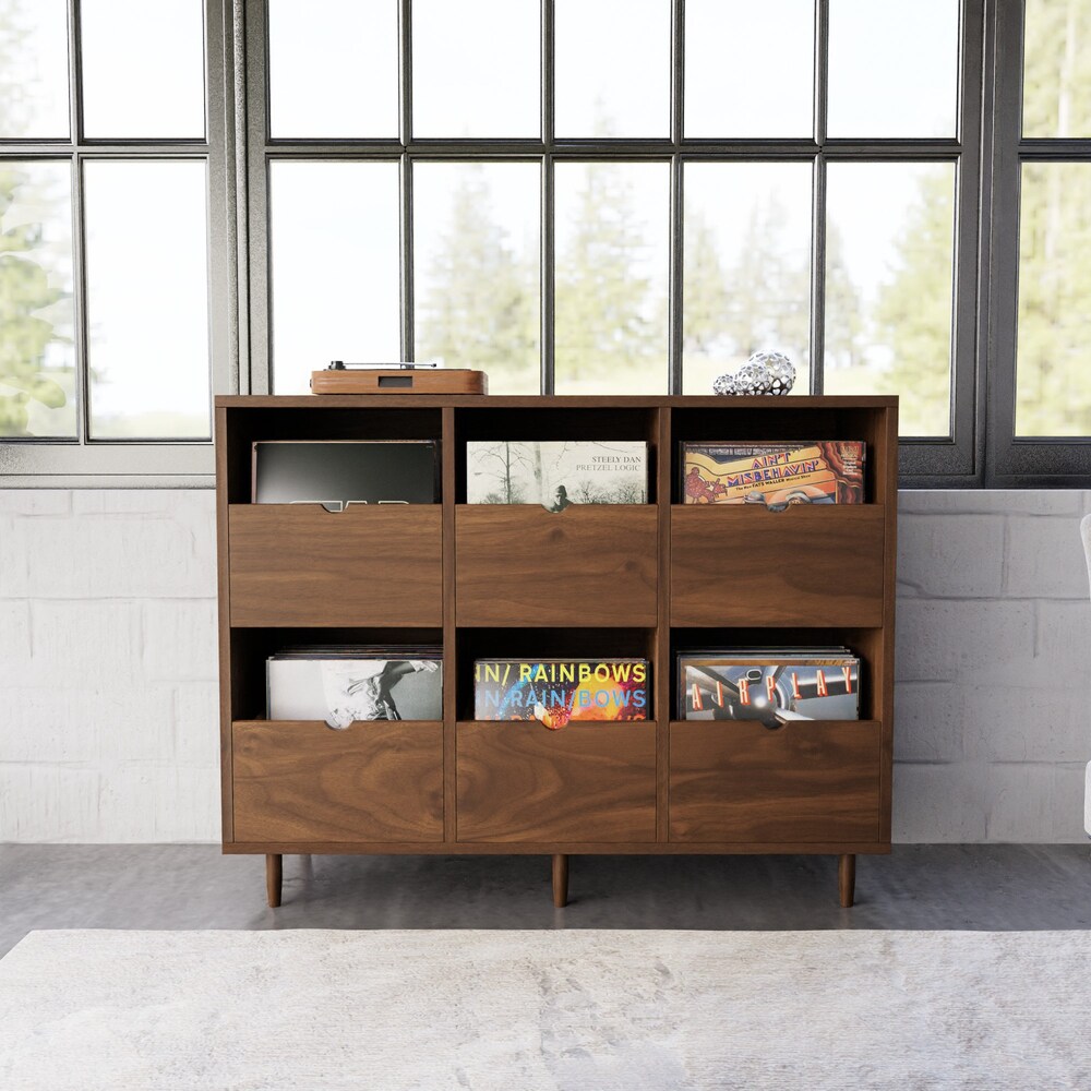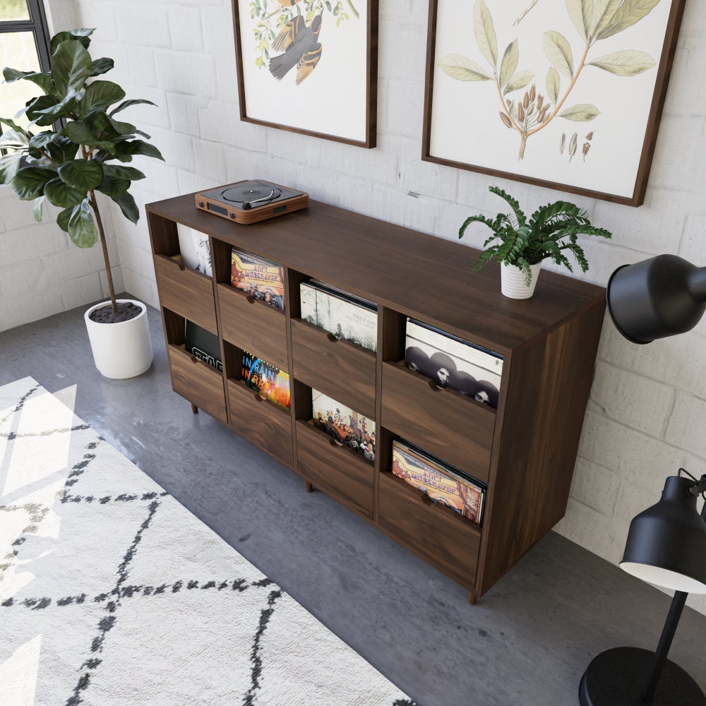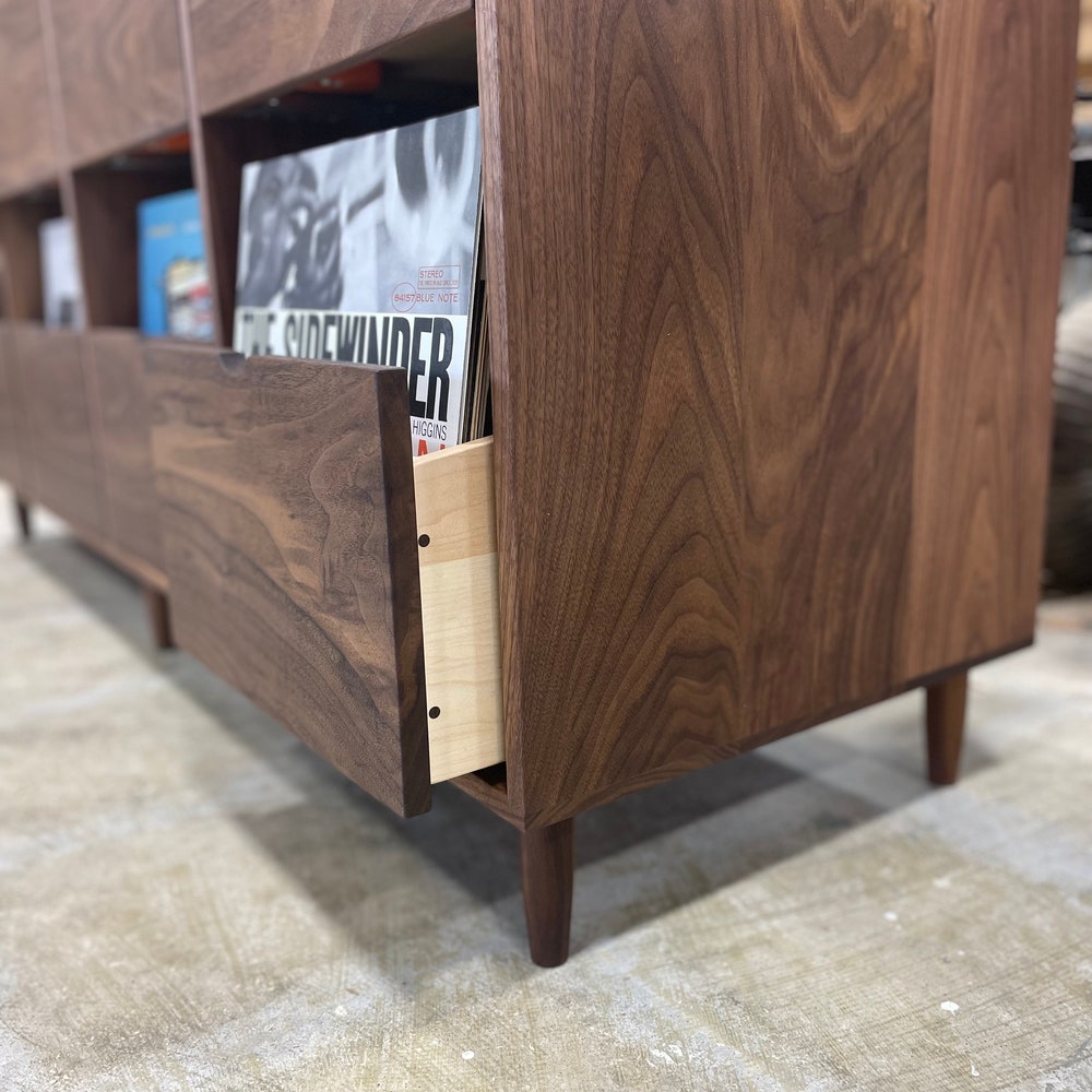 Are you ready to upgrade your vinyl LP storage situation? No more milk crates or plywood boxes for your record collection. This premium Vinyl Credenza is handcrafted from solid American Black Walnut hardwood with solid Maple soft-close drawers. Drawer slides are hidden under-mount and premium grade full extension. Flip through your records from the front!
