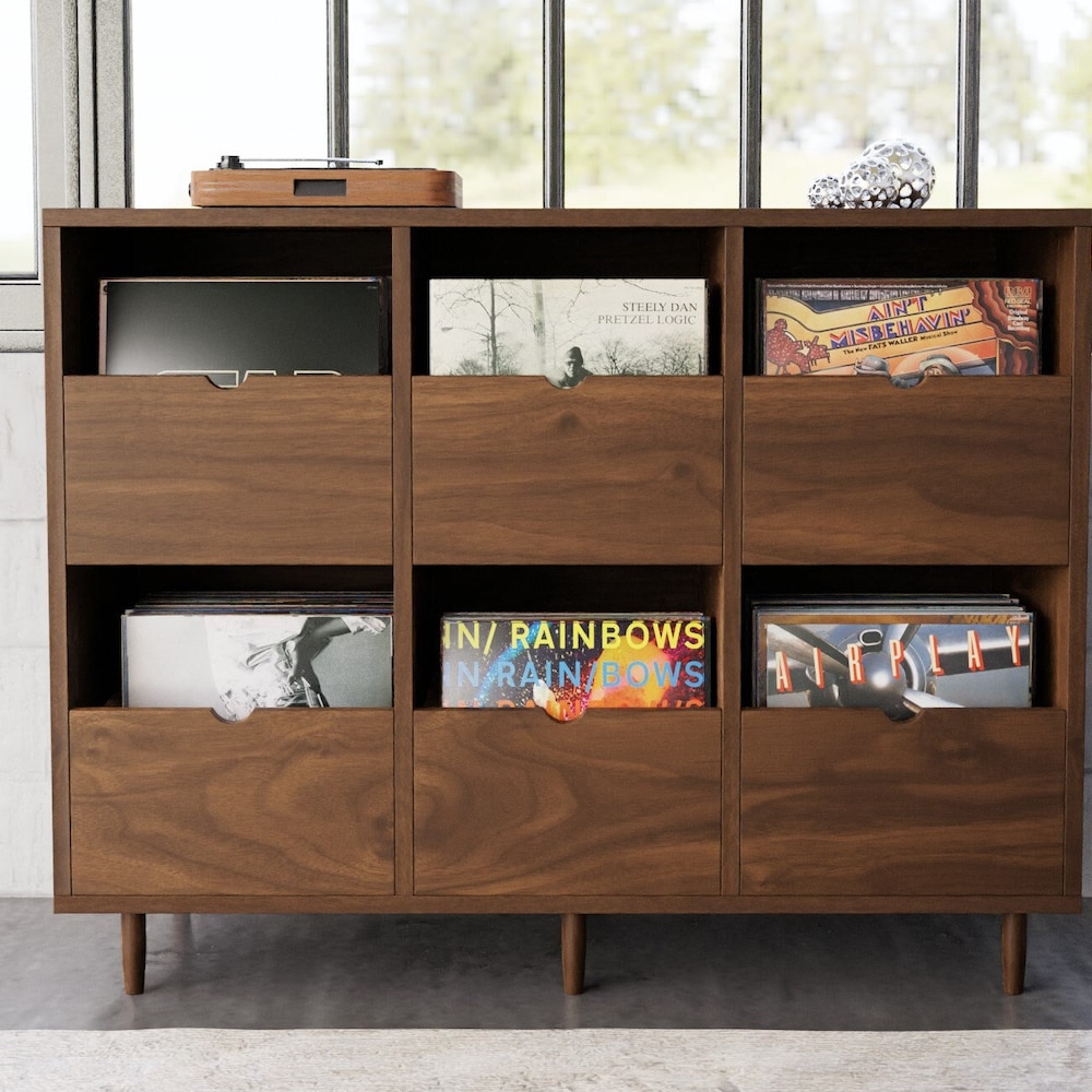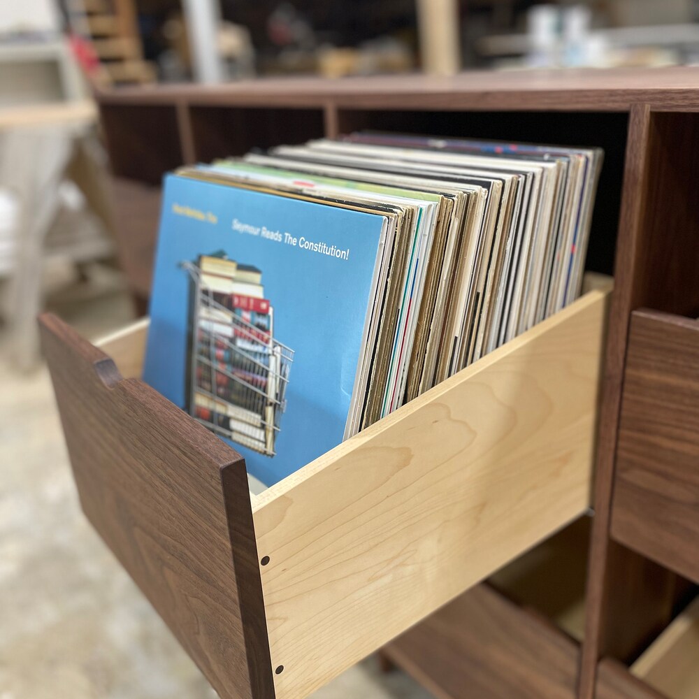 Are you ready to upgrade your vinyl LP storage situation? No more milk crates or plywood boxes for your record collection. This premium Vinyl Credenza is handcrafted from solid American Black Walnut hardwood with solid Maple soft-close drawers. Drawer slides are hidden under-mount and premium grade full extension. Flip through your records from the front!