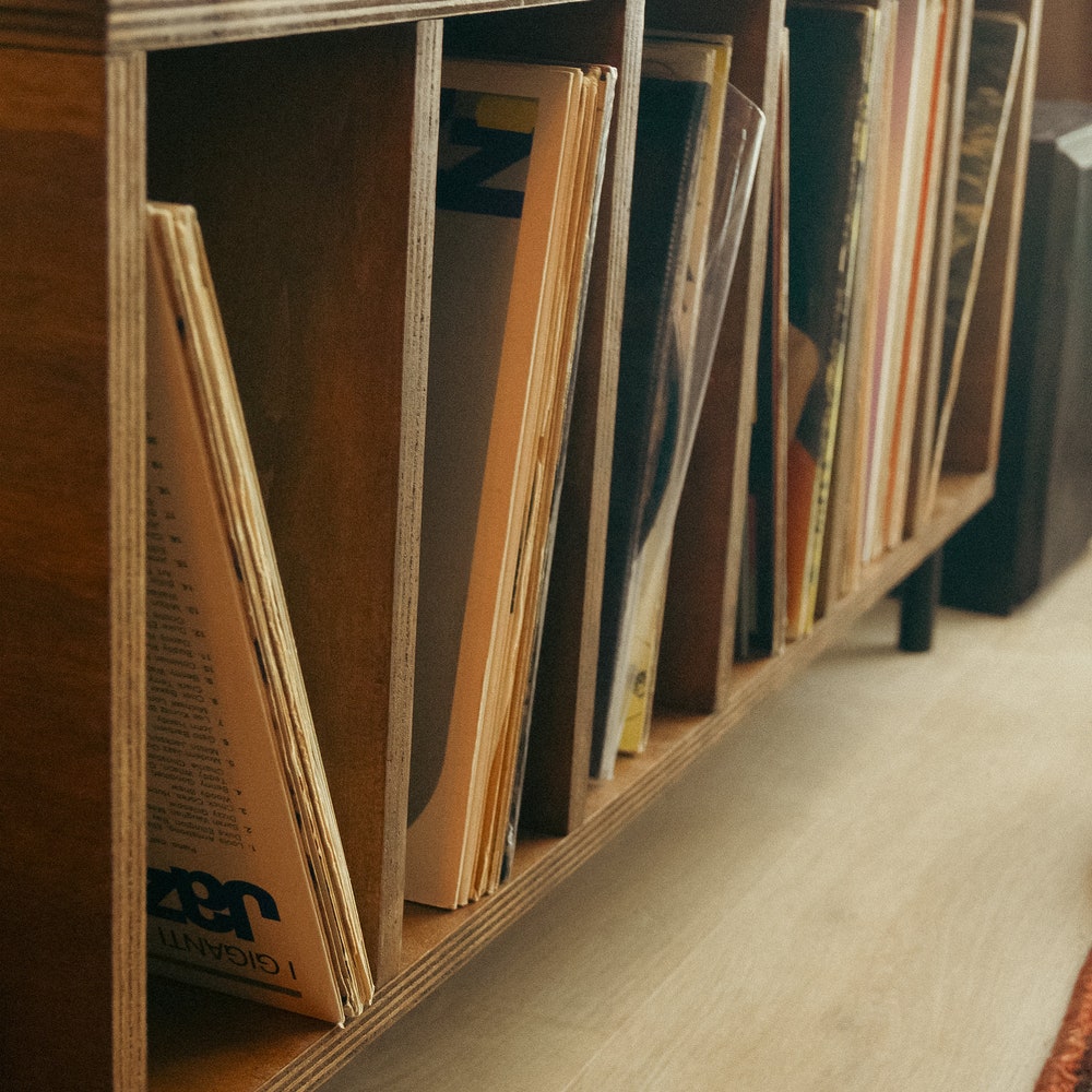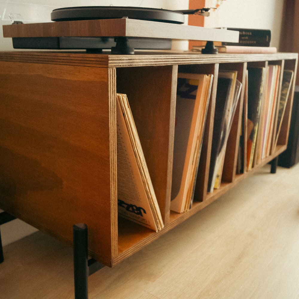 Record player stand ‘Ely’. A compact Recordplayer cabinet and an all-you-need for any Hi-Fi Audio Setup. Handmade from a quality plywood with a Real Wooden Veneer, giving it this rich Warm Wooden feel that can really Brighten up your space. Room for record players, Two amplifiers and Storage of up to 100+ of your favorite LPs. Available in multiple colors. Optional Back Panel.