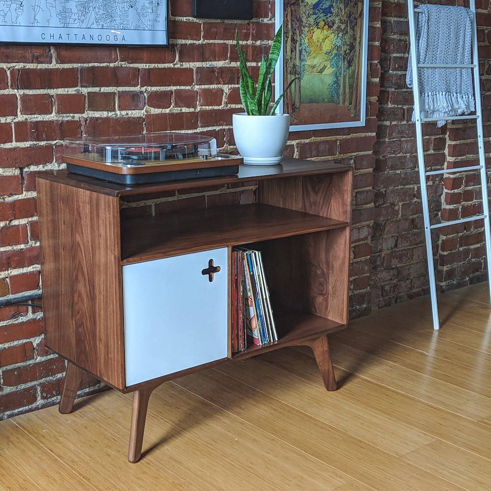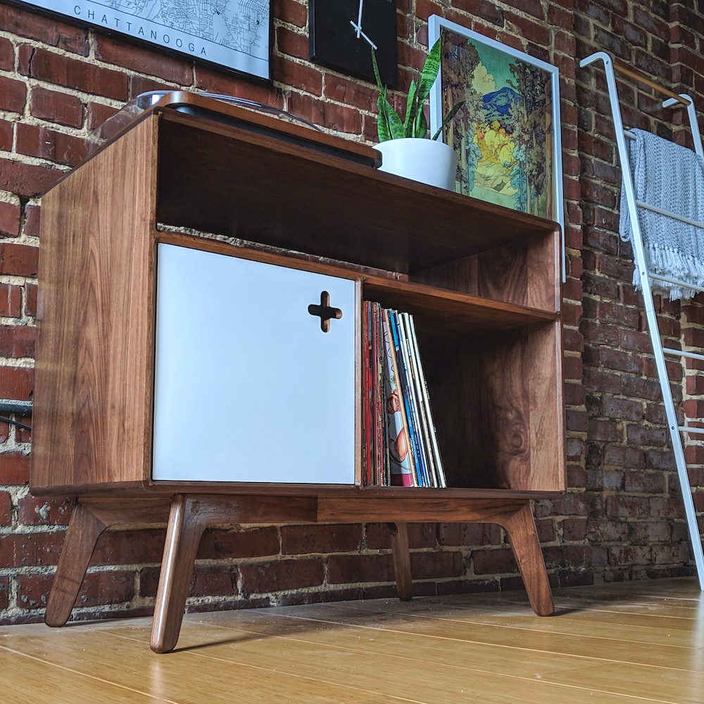 The mid century modern record cabinet “Plus” consists of a single door enclosed area with white drawer face, tapered legs, and the distinctive “Plus” hand hold cutout. It is made to last from solid walnut with a stunning satin finish. The white door face is slightly recessed to blend cleanly with the beveled inside edge and features soft closing hinges. The modern record table “Plus” also features solid legs that are easy to mount, but won’t wear out over time like you see from the flimsy metal mount brackets on so many other mid century style products.