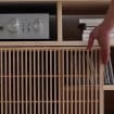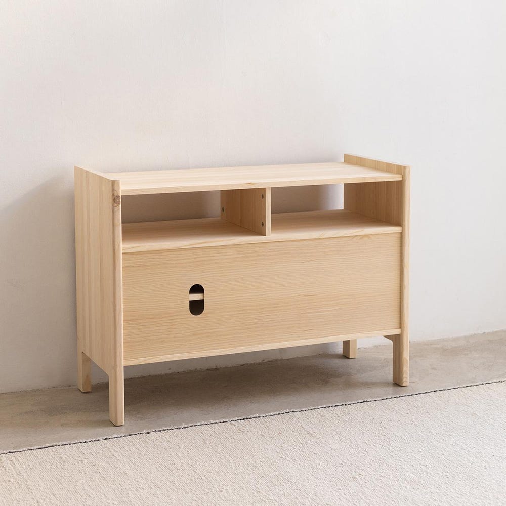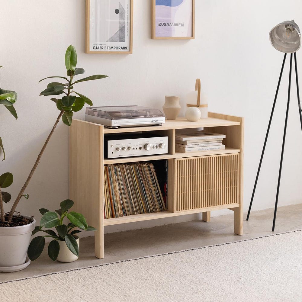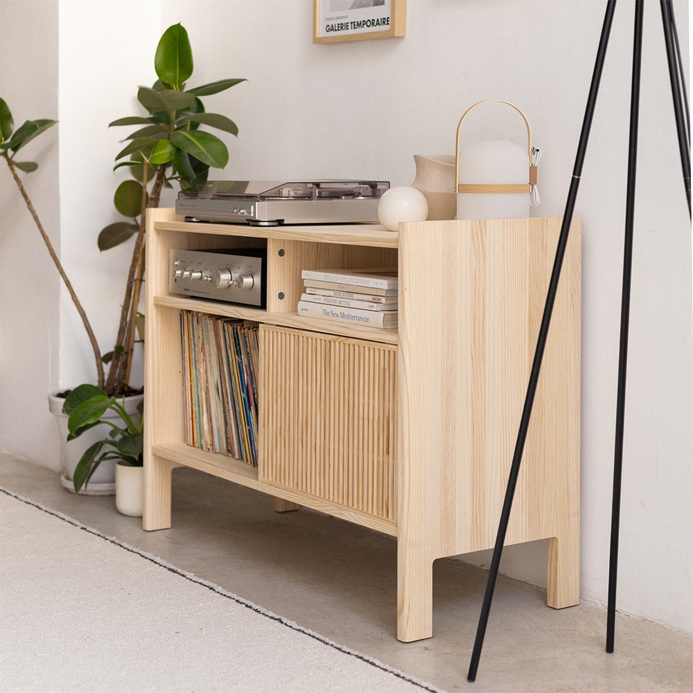 Mesquida Small, a storage unit for vinyl records, electronics, or decorative items. A unique sideboard, handmade and made from solid natural pine wood, a sustainable and durable material. It features one sliding door made of our vertical slat lattice, evoking the image of stacked vinyl records.