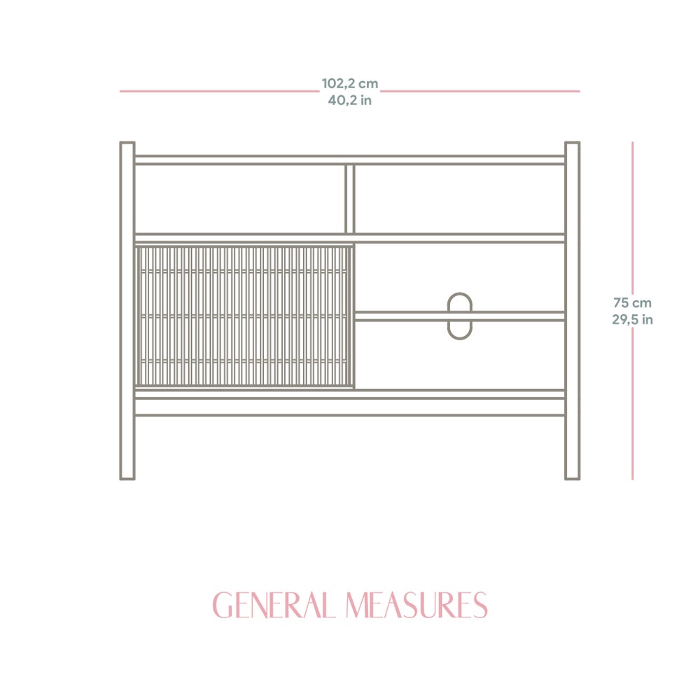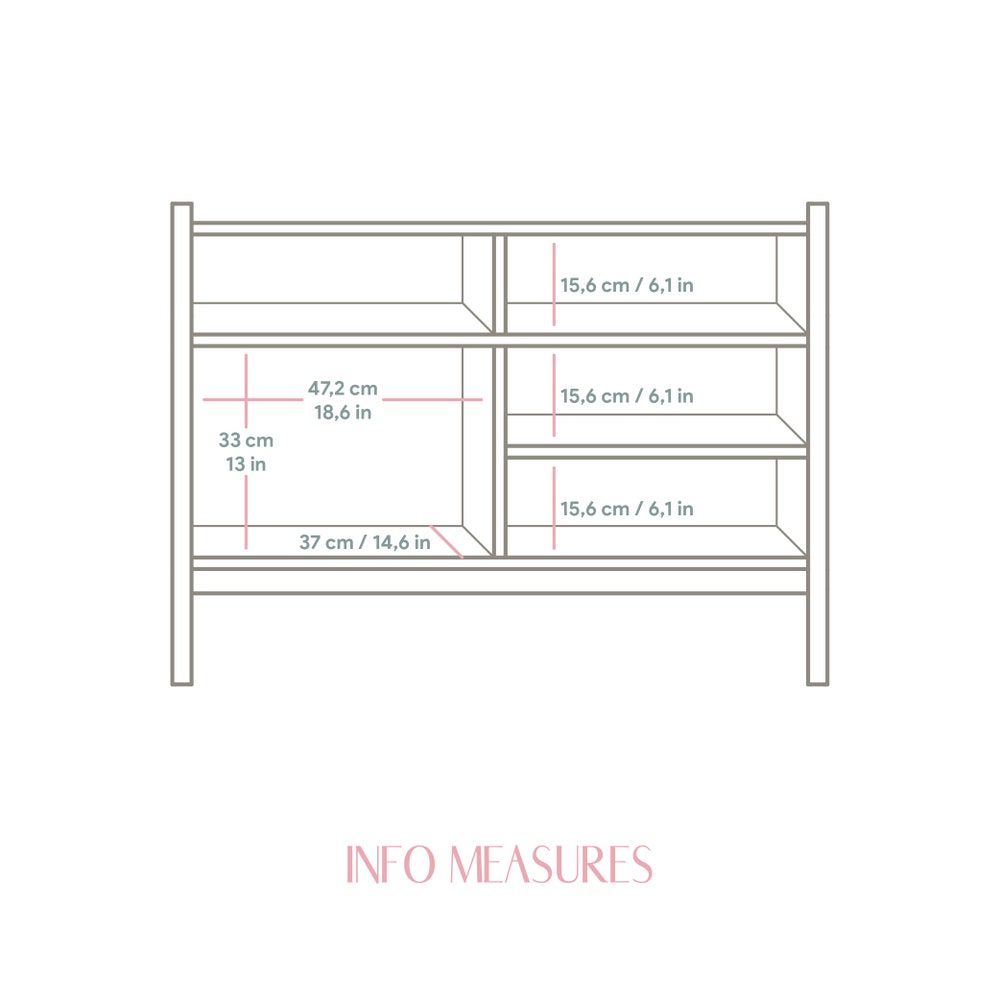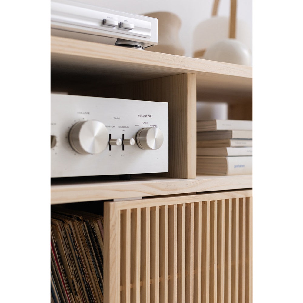 The legs, thicker than the rest of the furniture, provide both visual and structural robustness. They have a machined bottom and a protrusion on the top, giving it personality. The large compartments are ideal for storing vinyl, while the smaller ones can hold CDs or other objects. The top of the furniture is perfect for the record player, another essential element.