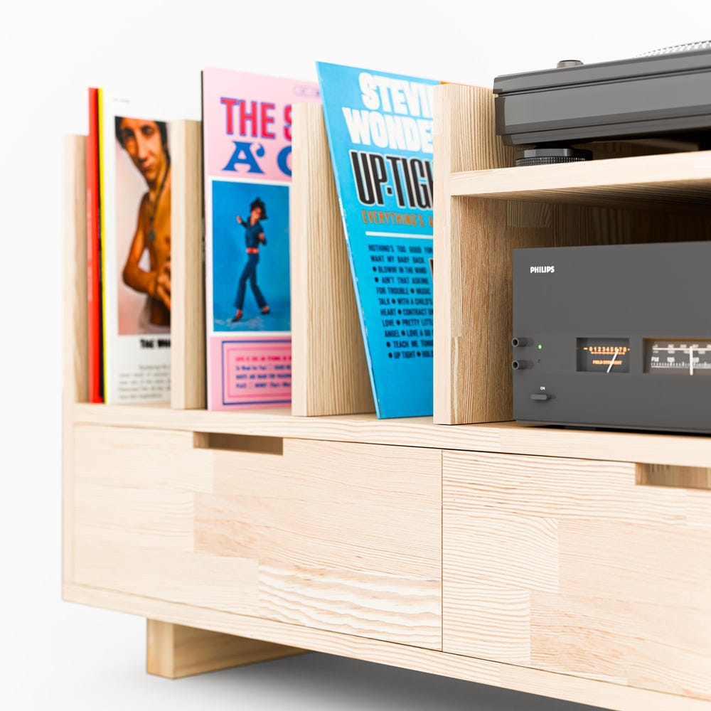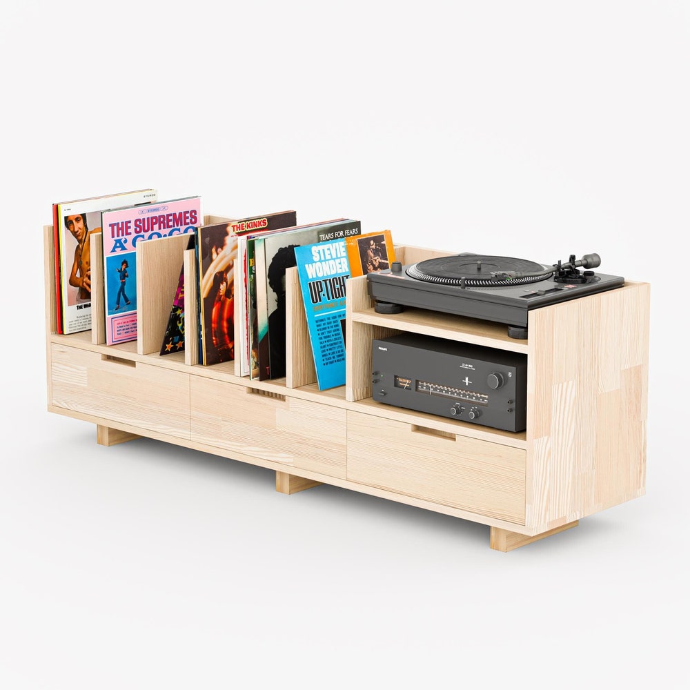 Bring style and organization to your vinyl collection with this handcrafted solid wood record player stand, designed to hold your turntable, amplifier, and vinyl records all in one place. Featuring dedicated slots to keep your records upright and easily accessible, this stand also includes drawers for additional storage, ensuring a tidy setup. Its minimalist, mid-century modern design fits perfectly in any home, making it both a functional and aesthetic addition to your music space.