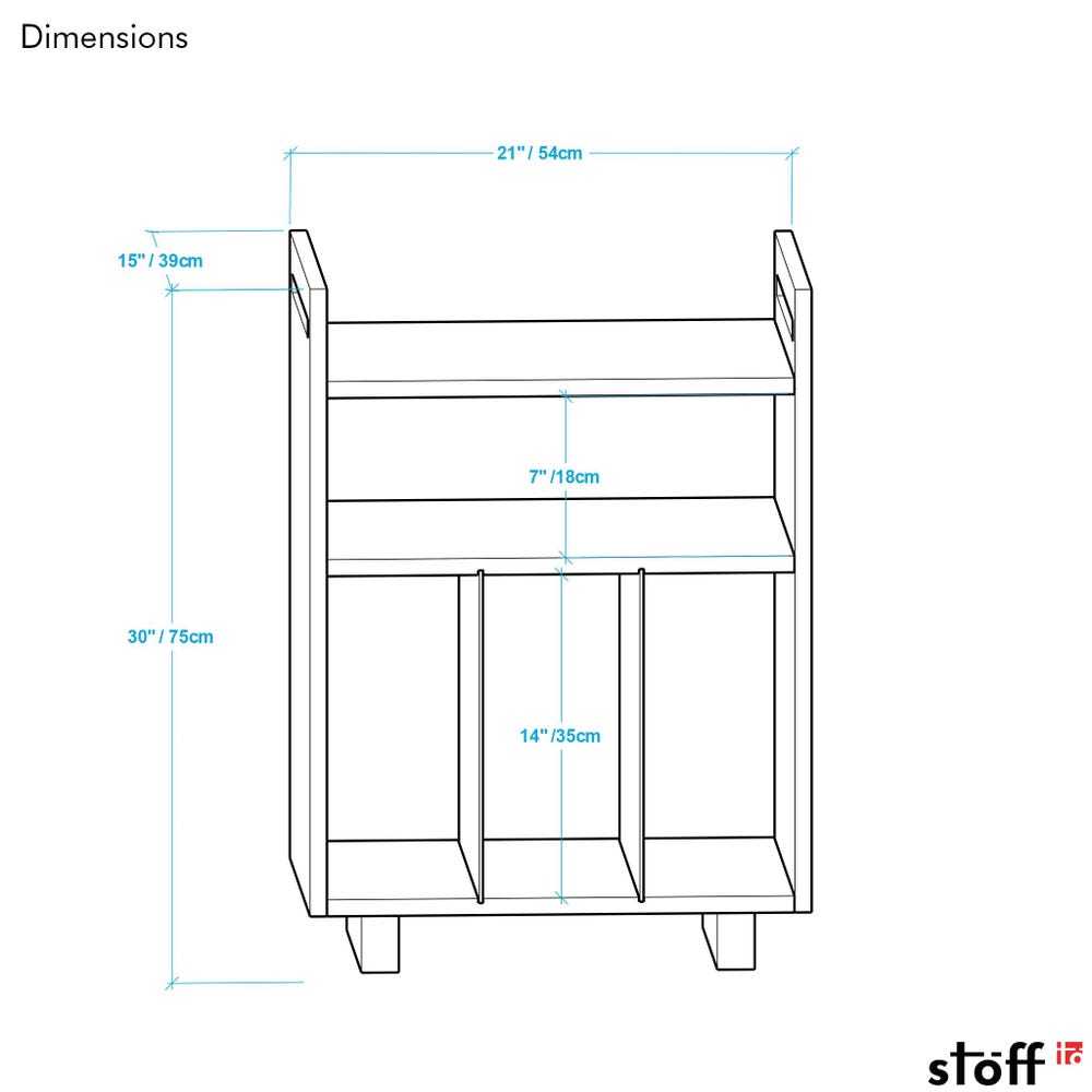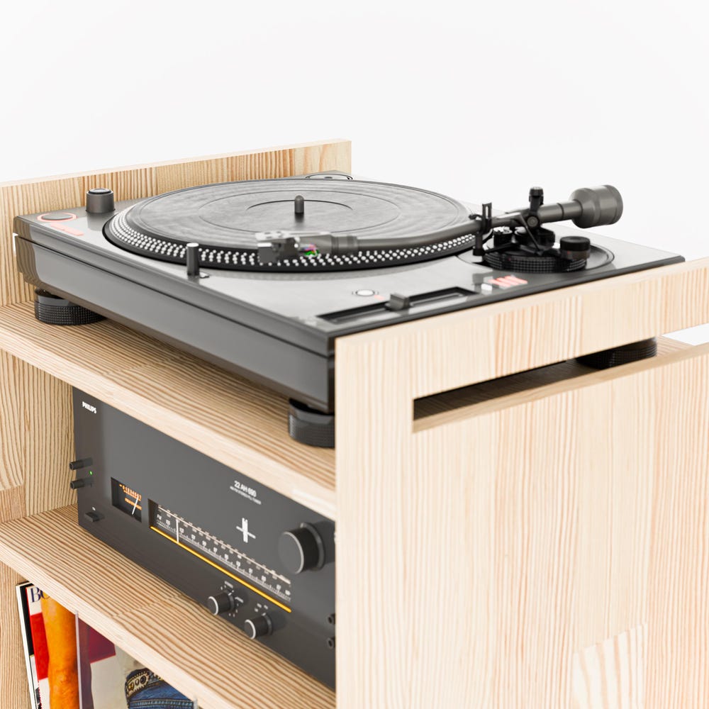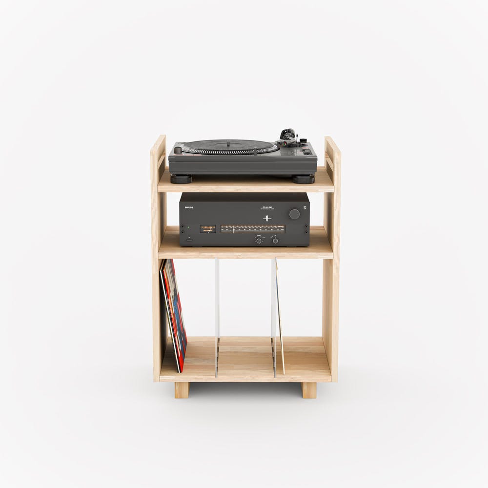 Crafted from solid pine wood, this stylish stand is designed to beautifully showcase your vinyl collection. Featuring removable plexiglass dividers, it keeps records organized while offering easy access. The stand also includes dedicated space for both a turntable and amplifier, making it a functional and elegant addition to any music lover’s space. With its minimalist design, it complements any modern or Scandinavian-inspired decor.
