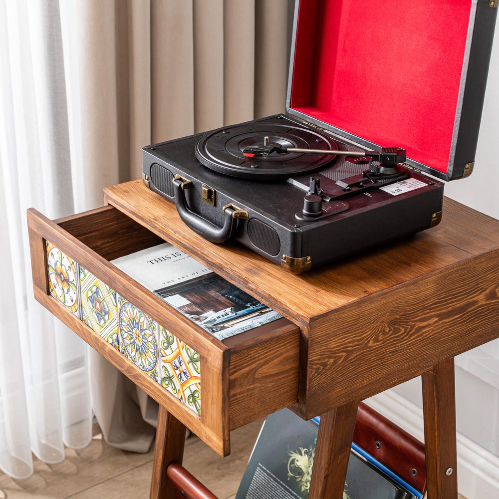 – Record Player Console has a drawer under the top which has an opening side with tiles.