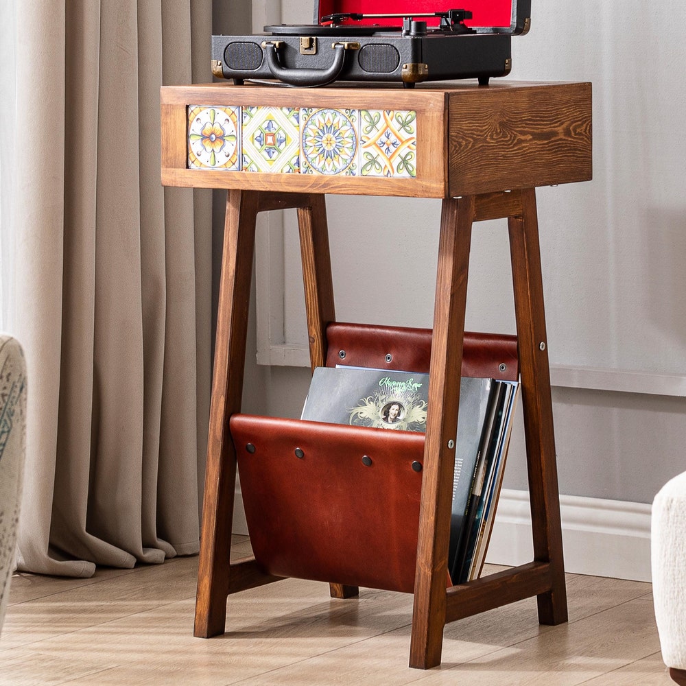 Record Player Stand with Tiled Drawer, Leather Storage, Vinyl LP Cabinet, Record Player Console, Wooden Turntable Stand, End Table,