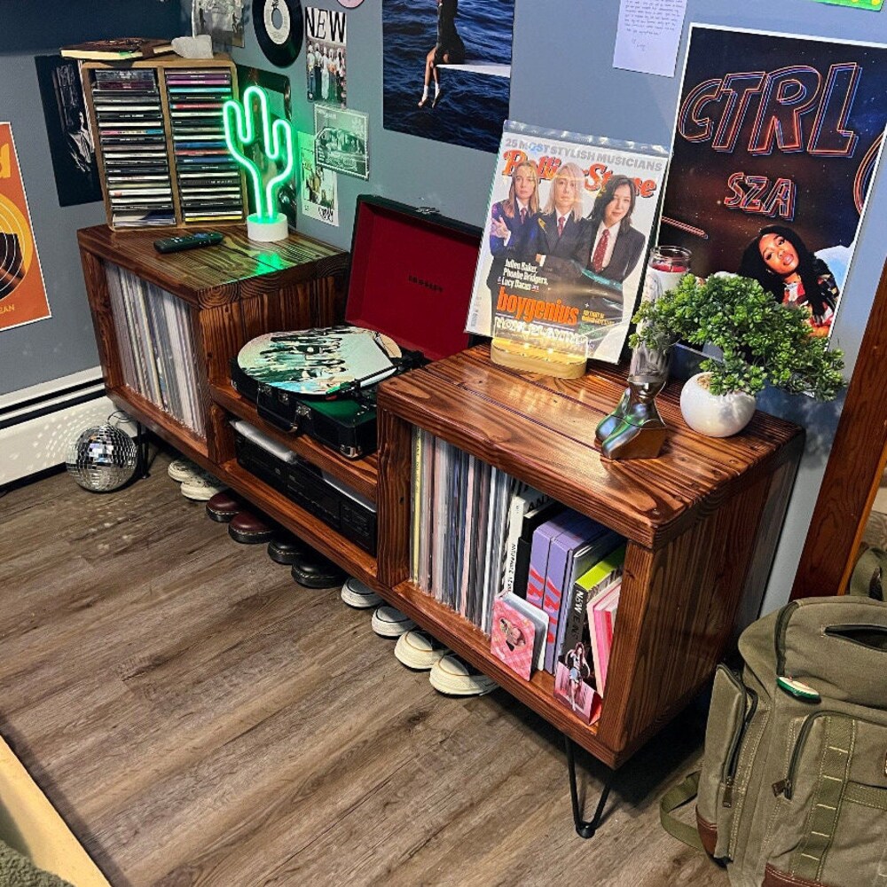 Transform your vinyl collection into a stunning audio equipment display case with this wooden box LP holder and organizer, featuring strong steel legs that makes it the perfect record cabinet storage solution. This versatile vinyl record storage system combines elegant aesthetics with practical functionality, creating the ideal collection organizer for music lovers.