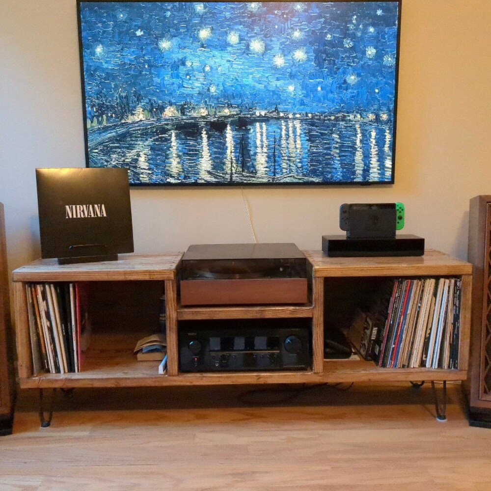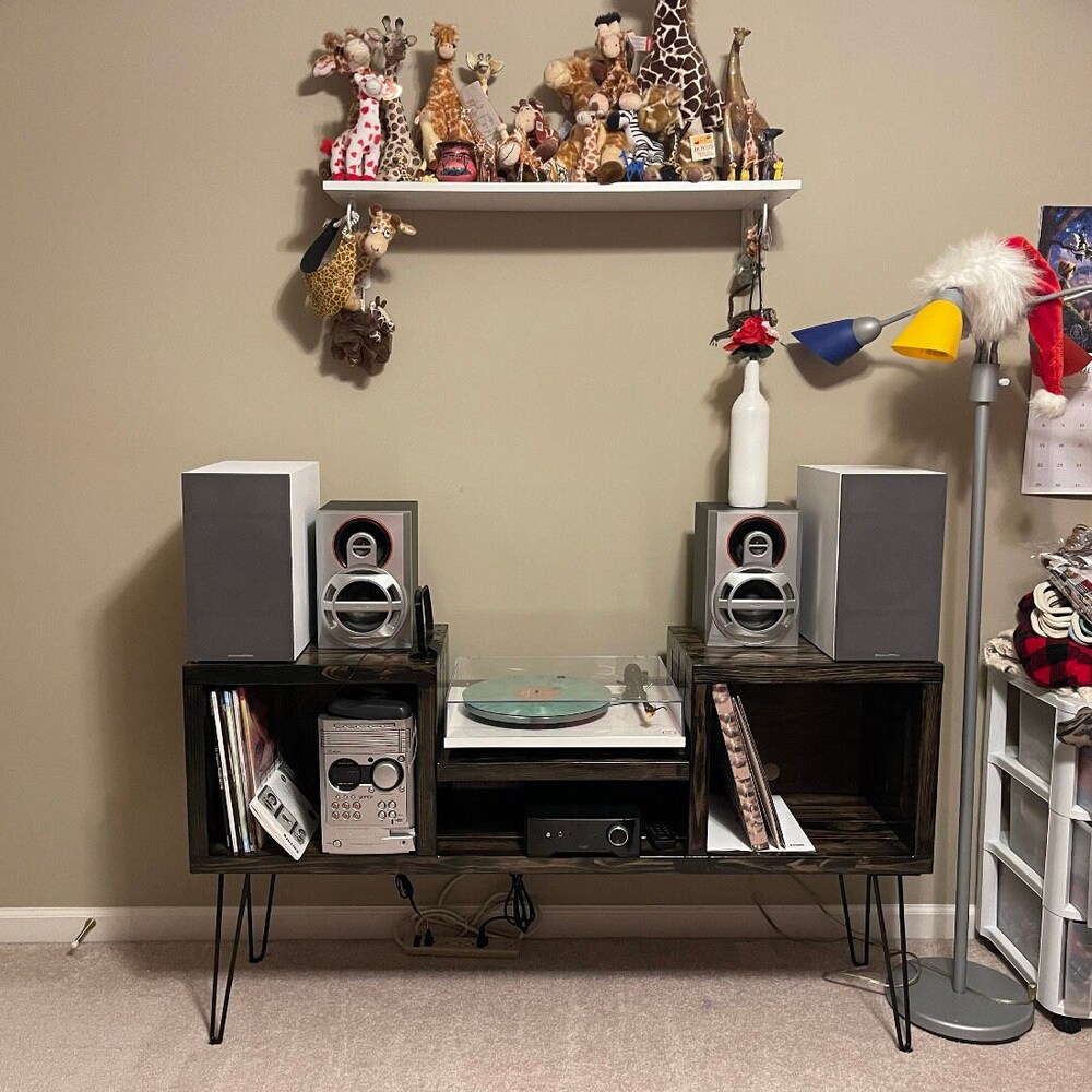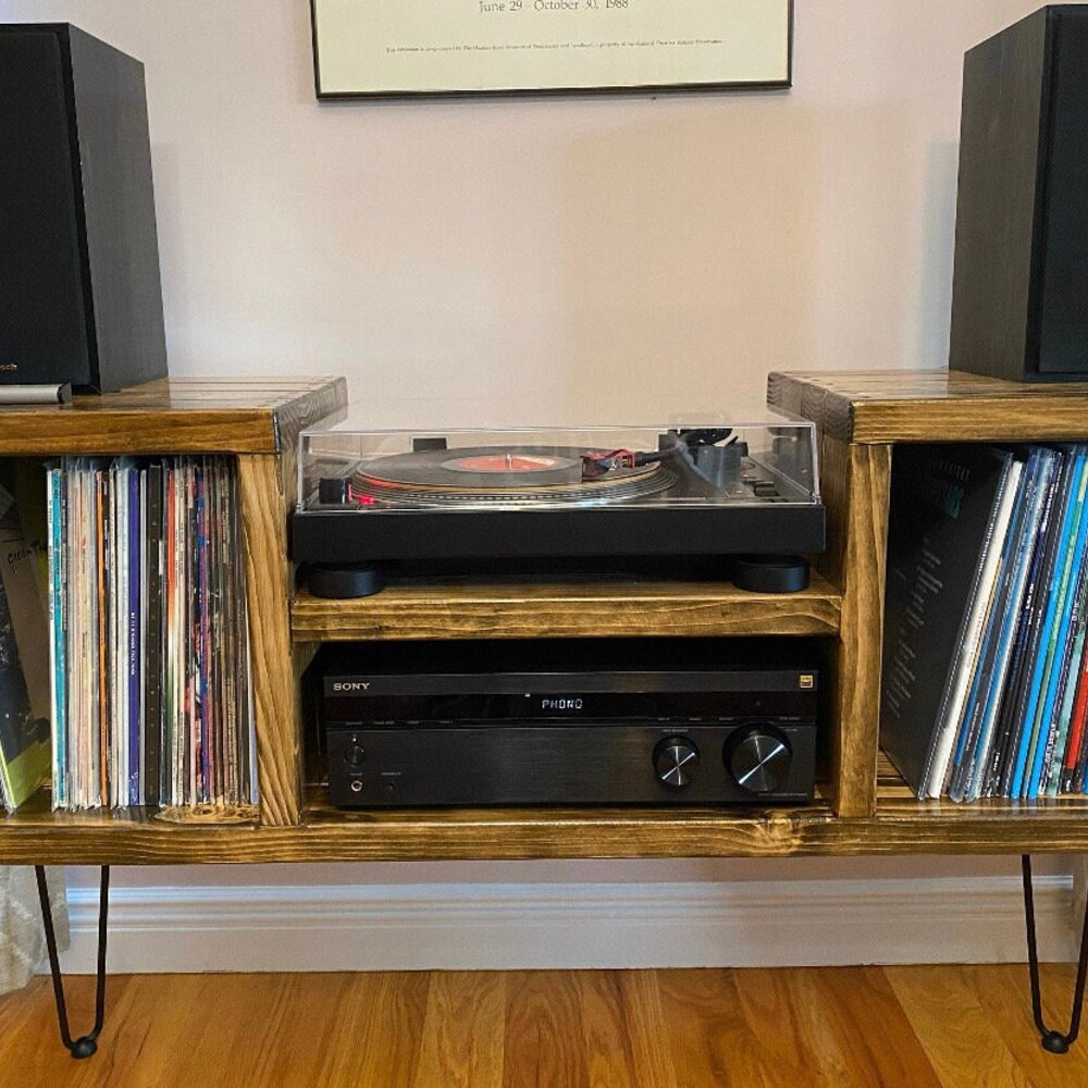 * Fixed shelf with customizable width to accommodate varying audio gear and collection needs