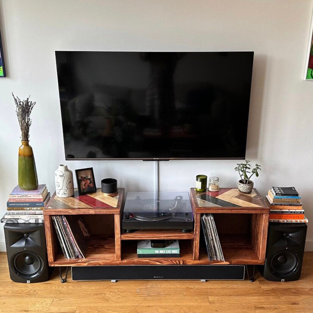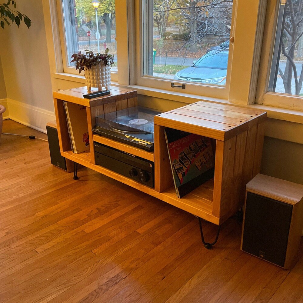 -Option 1: Upgrade to the longer/taller legs. Vinyl Record Storage (or Recs as we call them) have a 16″ wooden height. While the smaller Entertainment centers/Tv Stands (or Ents) have a 12″ wooden height. Both come with standard 6″ hairpin legs.