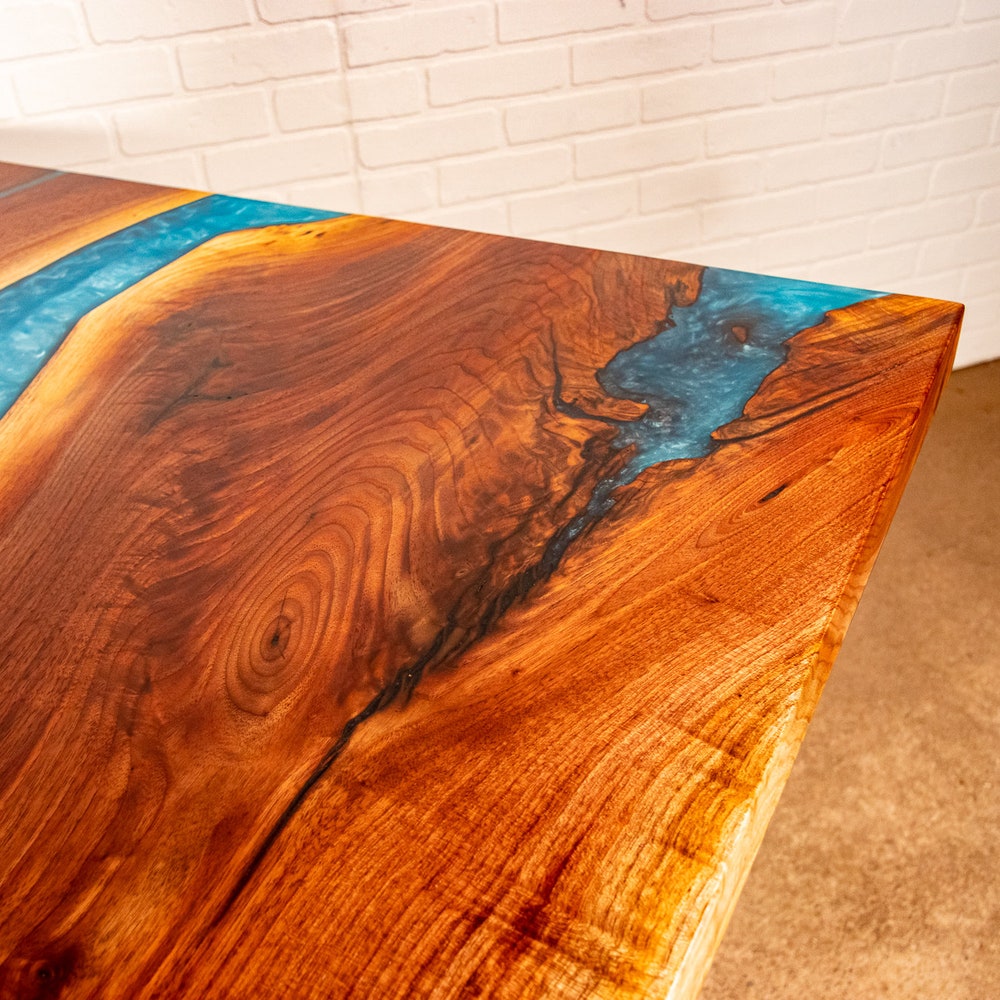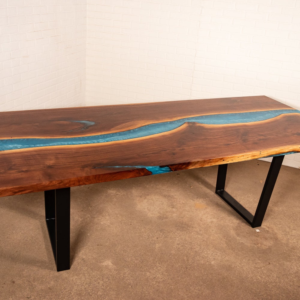 This particular table combines walnut slabs joined together by a river of blue epoxy. Other colors of epoxy are possible. Once the table was built, it was sanded and finished with an all-natural oil that cures to a durable matte finish. We like this finish because it is durable having been originally designed for floors and is food safe.