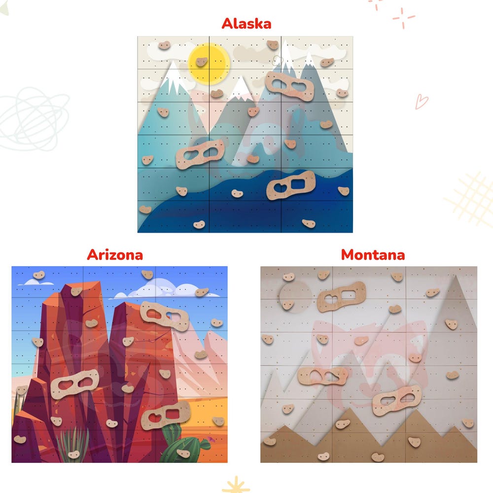 This set can include either 18 rock climbing panels, each designed to mount securely on standard American wall studs. The climbing stones are arranged according to the pattern on the panels to create a unique climbing area or obstacle course right in your home.