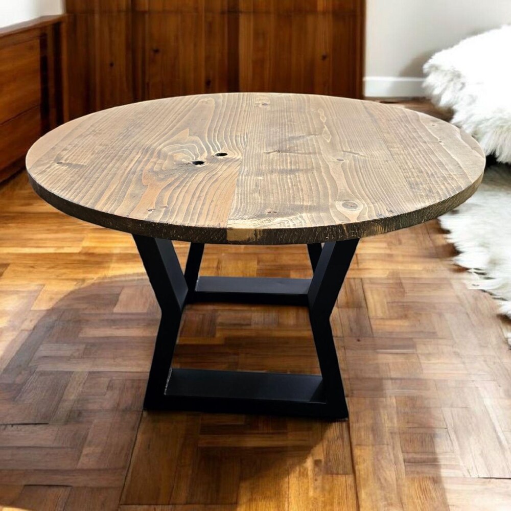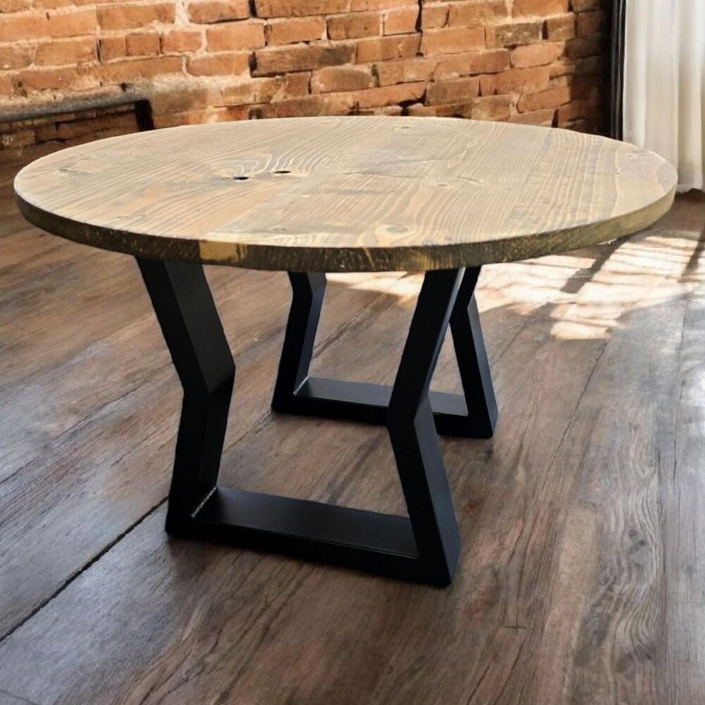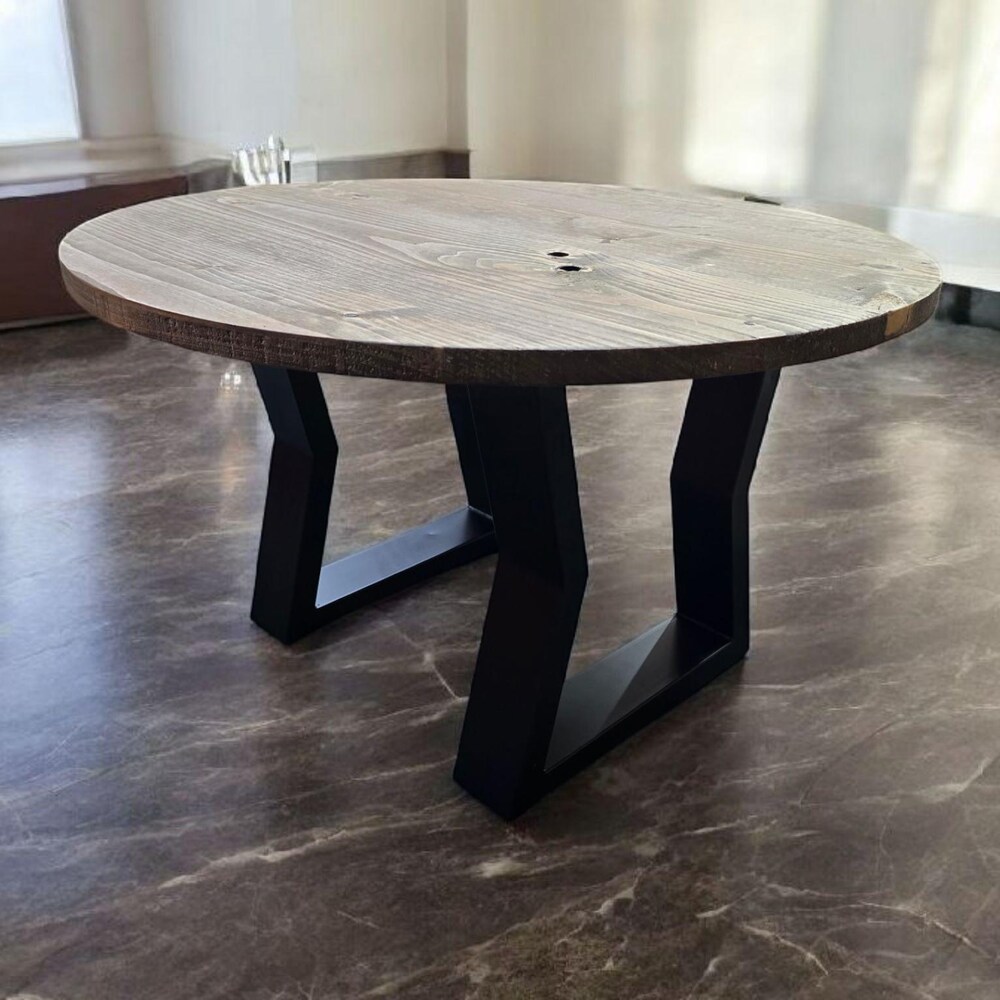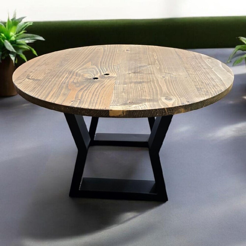 Solid Wood round coffee table with heavy duty steel frame legs.