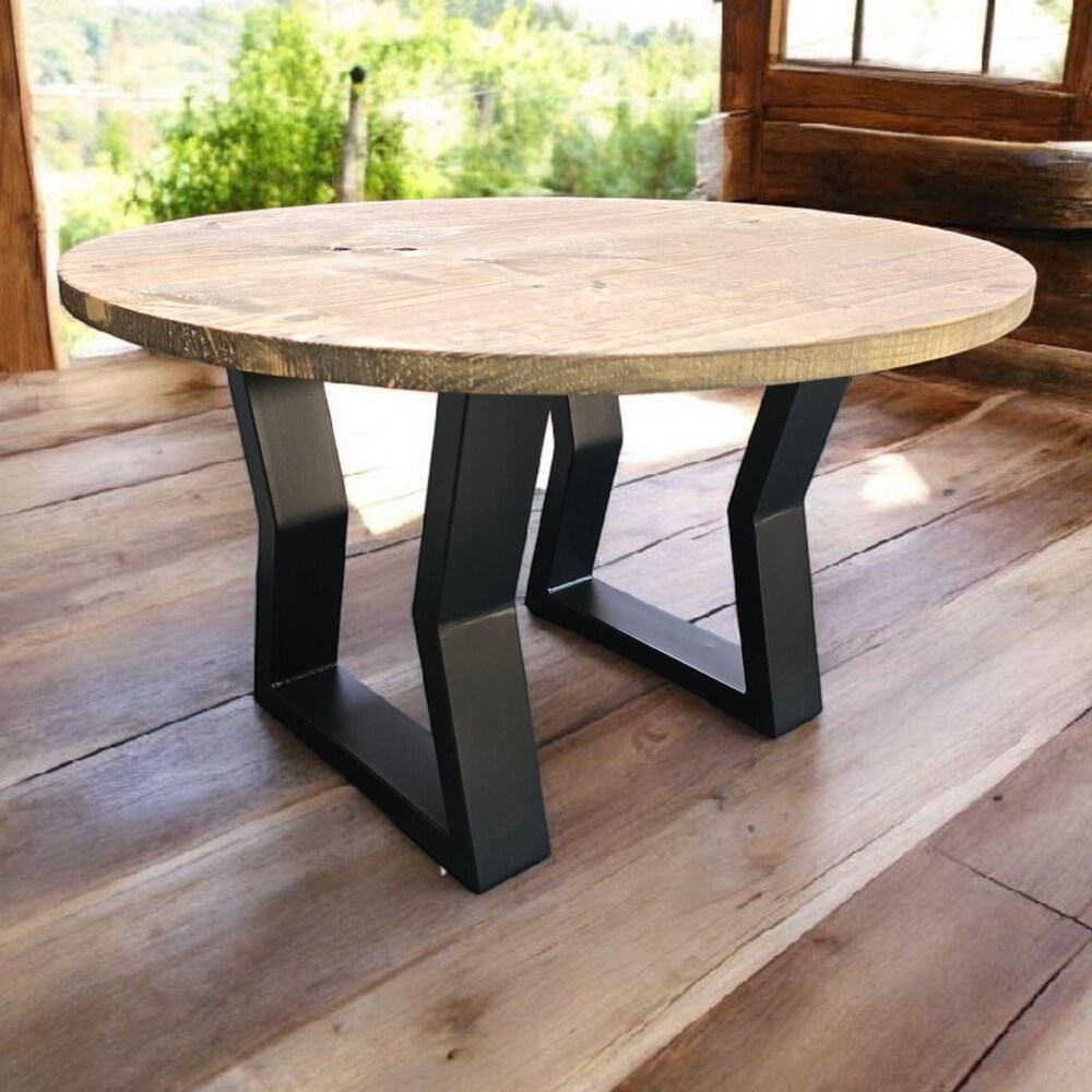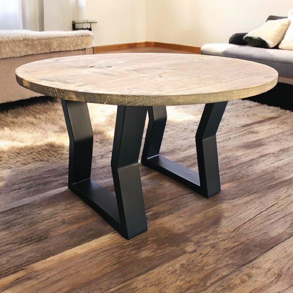 Round Coffee side table solid heavy duty steel legs Rustic vintage reclaimed wood furniture home decor industrial living room interiors