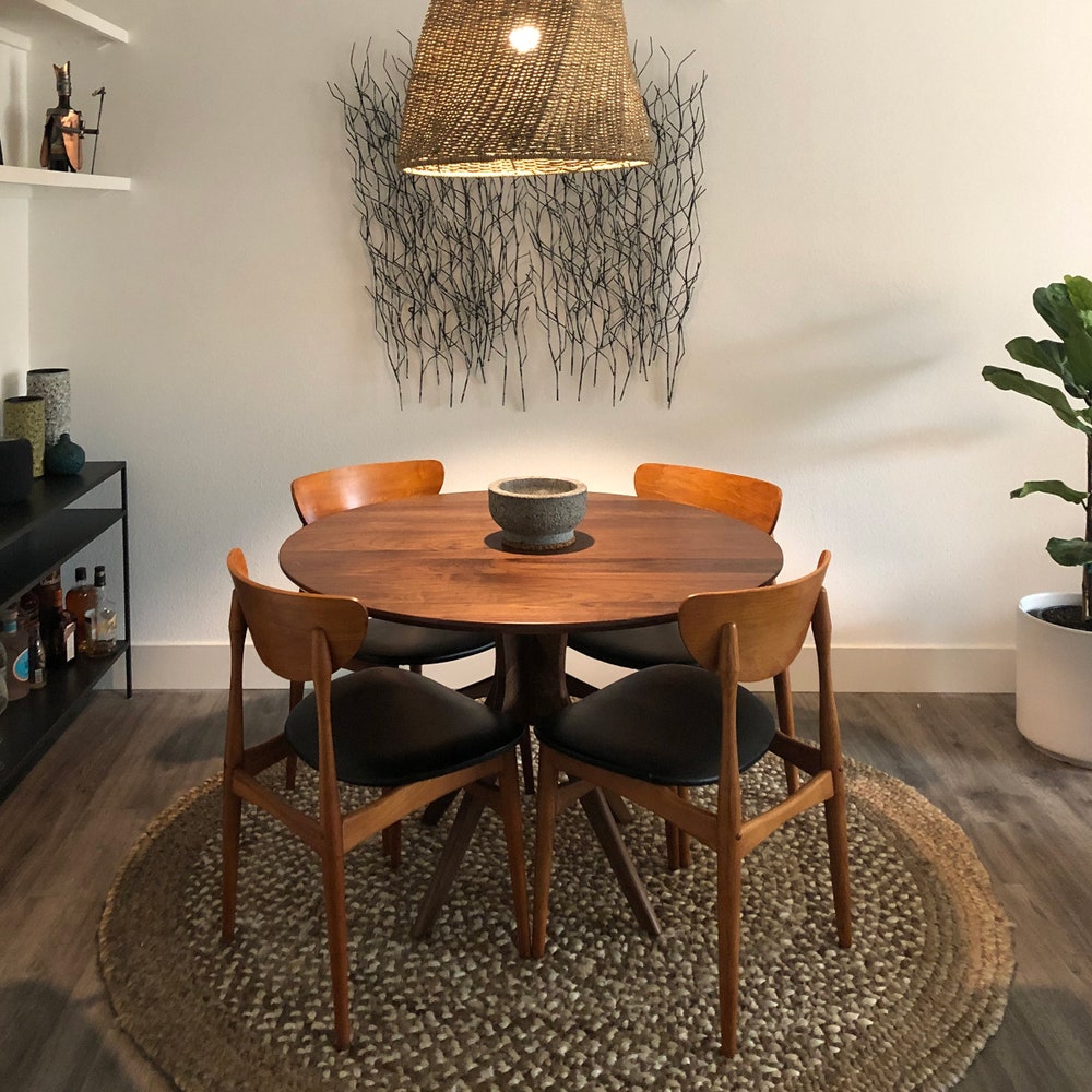 Our “Kapok” round dining table fits seamlessly into any dining room or kitchen decor style. With mid century modern good looks and solid hardwood construction this dining table adds timeless beauty that you’ll love and your guests will admire.