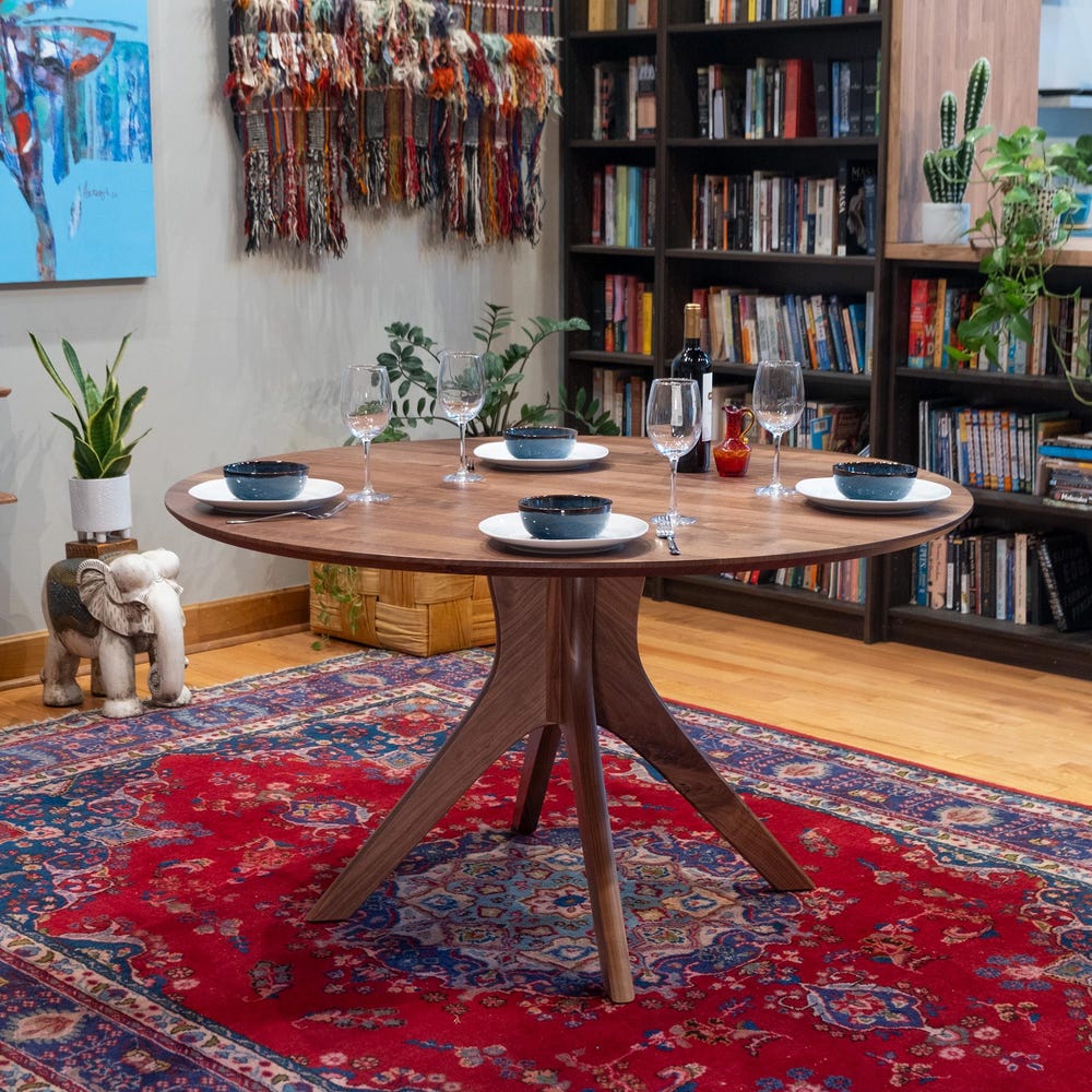 Your round dining table is meticulously handmade for you in your choice of solid cherry, walnut, oak or mahogany wood (shown here in walnut). Your table gets its color from the natural beauty of the wood, not stains or dyes.