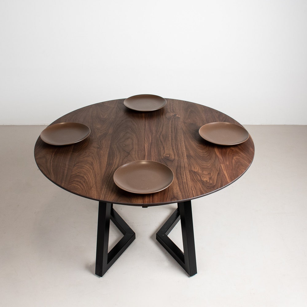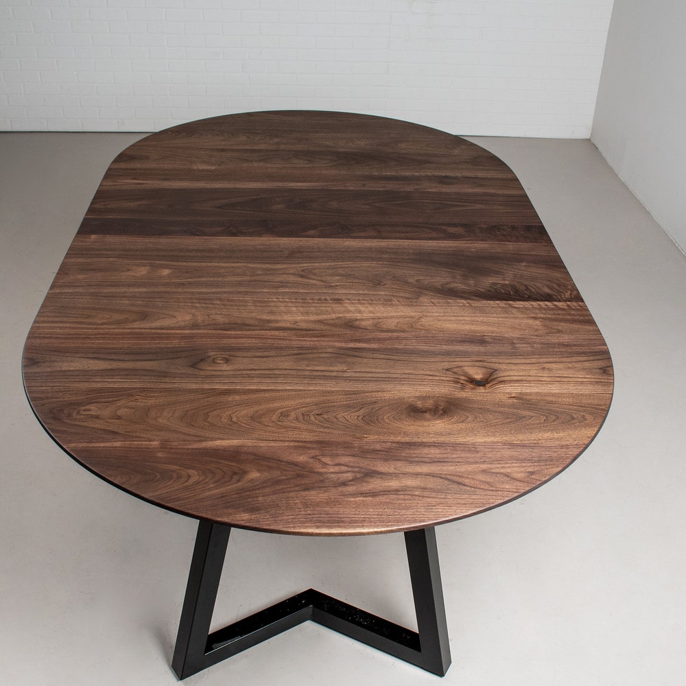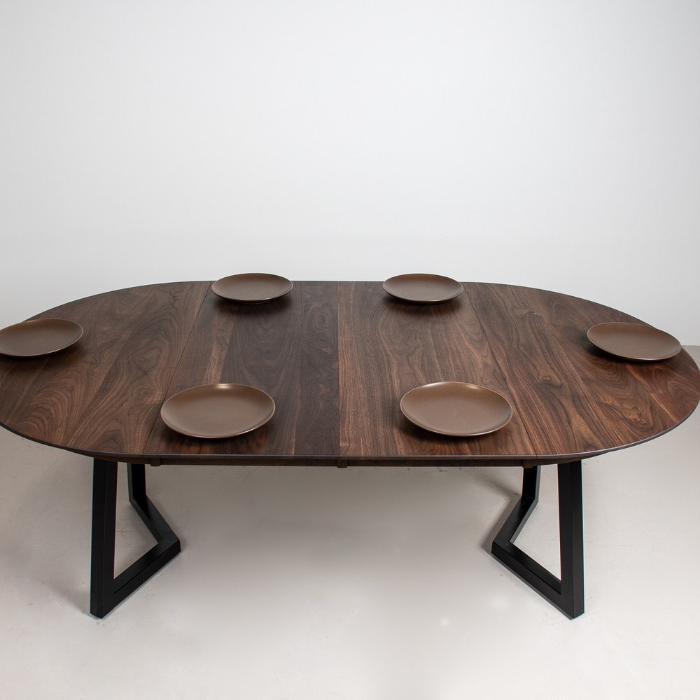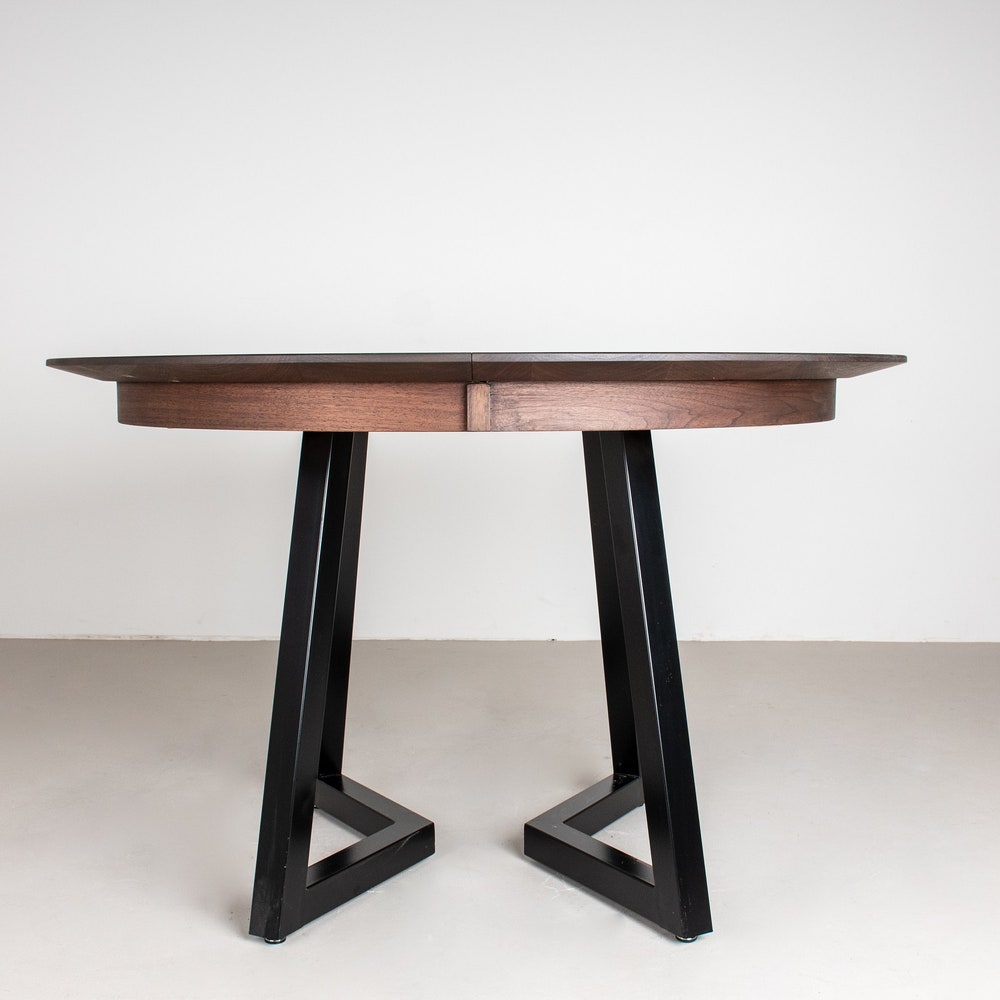 Bring a mid century modern flair to your dining room with this round walnut dining table with leaves. The blackened finish on the walnut with the bevelled sarita edge give this table a sleek mid century look. We build every table to order so there are many ways to make this table perfect for you.