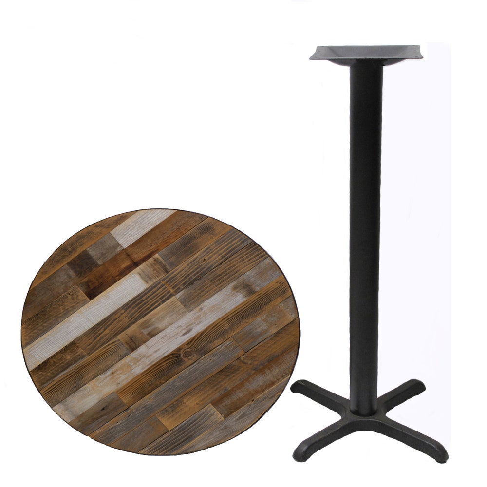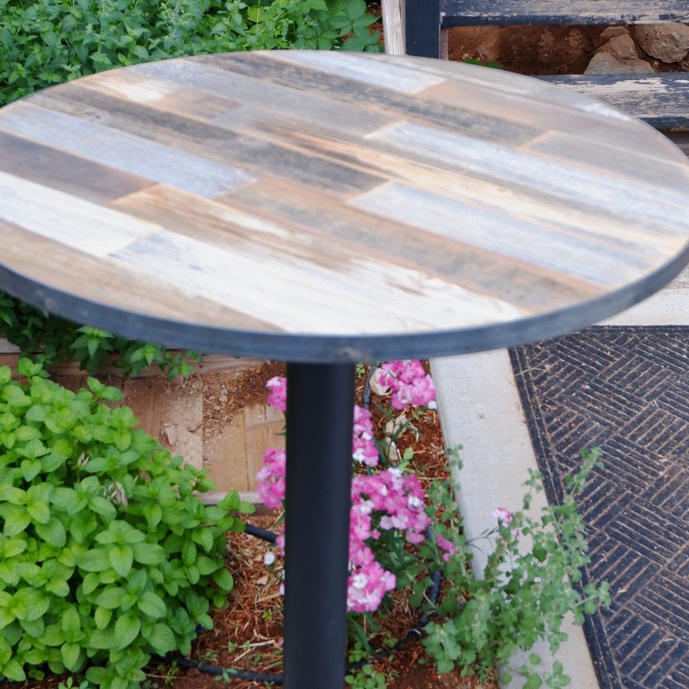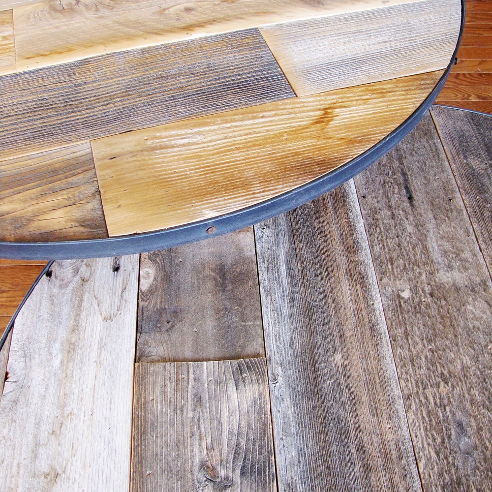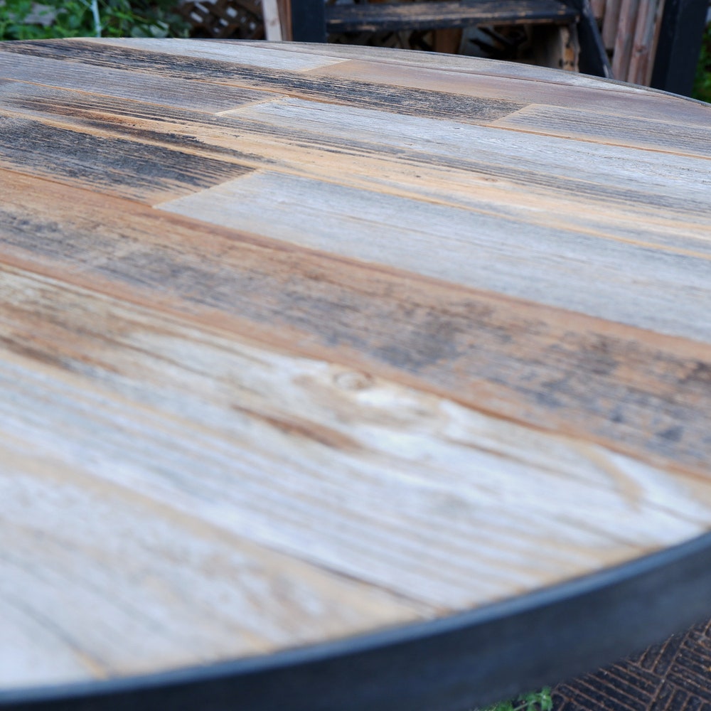 Made with The REAL thing. This is not imitation reclaimed / barn wood. It is naturally aged, recycled, and one of a kind. The table round is made from reclaimed wood on the top and a substrate underneath, this may be strand board, medium density fiberboard or plywood (depending on availability. This allows for strength and Each table is finished with a raw steel metal ring around the outer edge