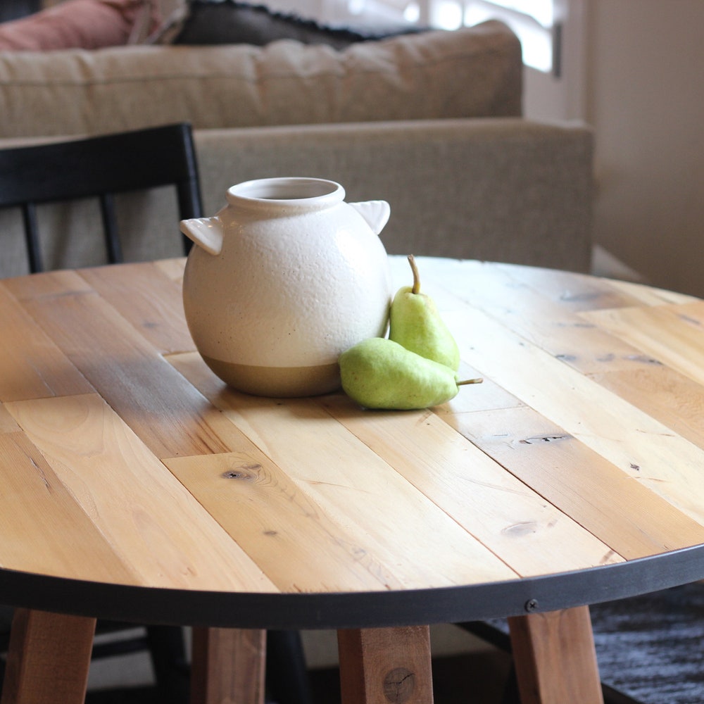 Made with The REAL thing. This is not imitation reclaimed / barn wood. It is naturally aged, recycled, and one of a kind. The table round is made from reclaimed wood on the top and a substrate underneath, this may be strand board, medium density fiberboard or plywood (depending on availability. This allows for strength and Each table is finished with a raw steel metal ring around the outer edge