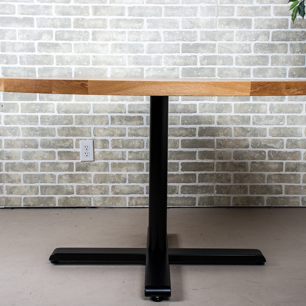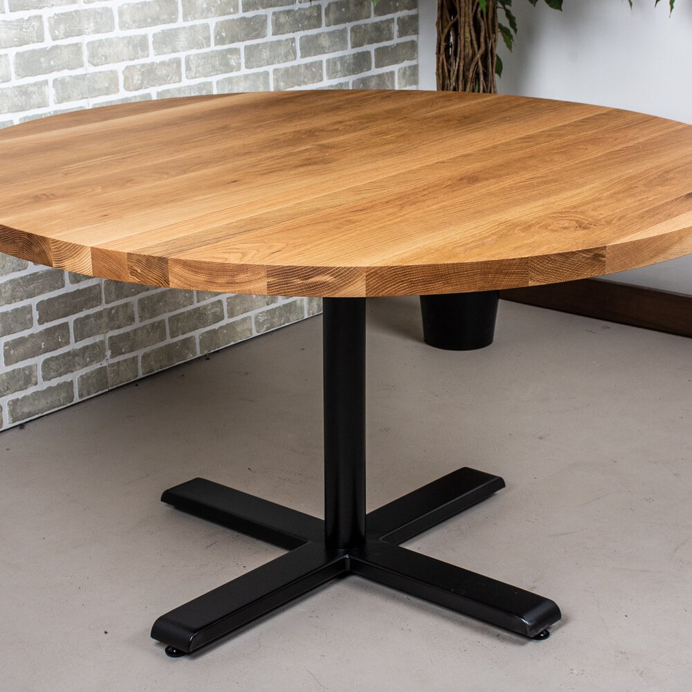 The design of this round oak table is tried and true. The circular top is great for conversation and is easy to walk around, making it a great choice for high traffic area. And the simple steel pedestal base leaves lots of room for legs. We build every table to order so there are many ways to make this table perfect for you.