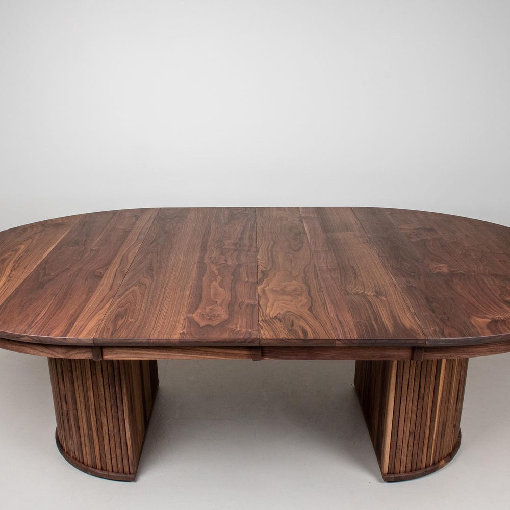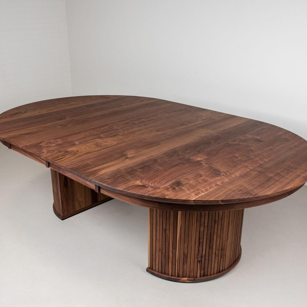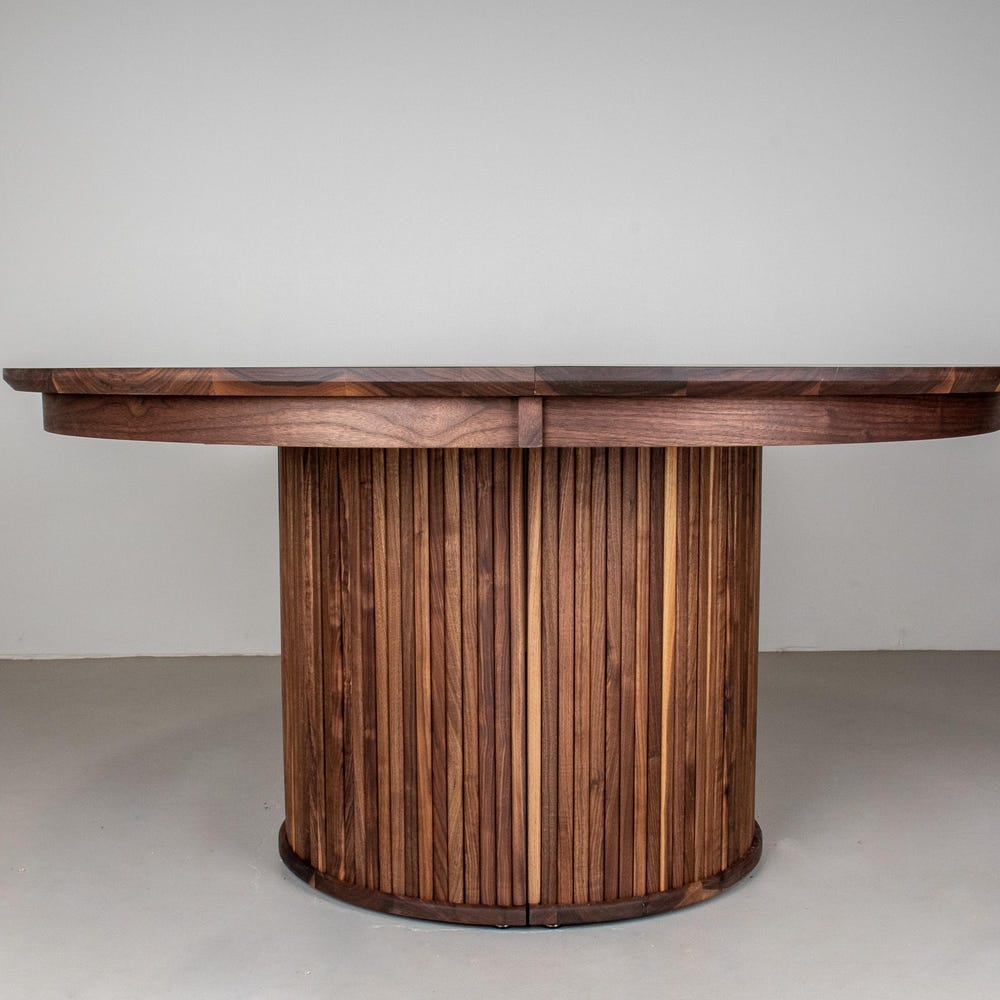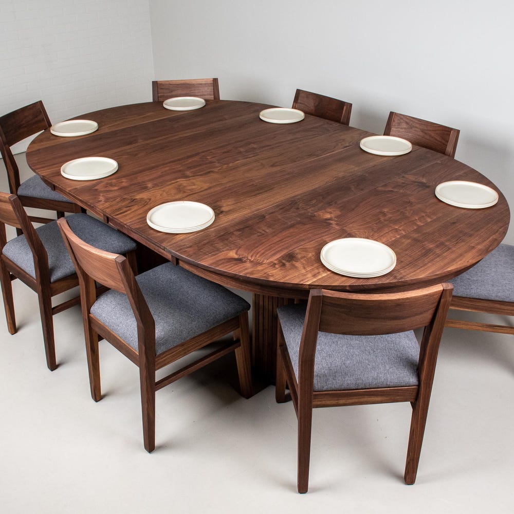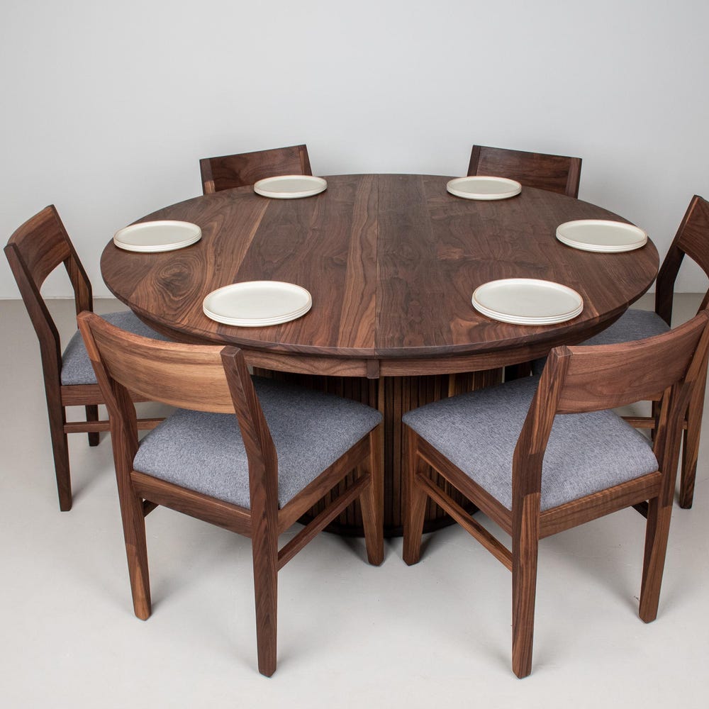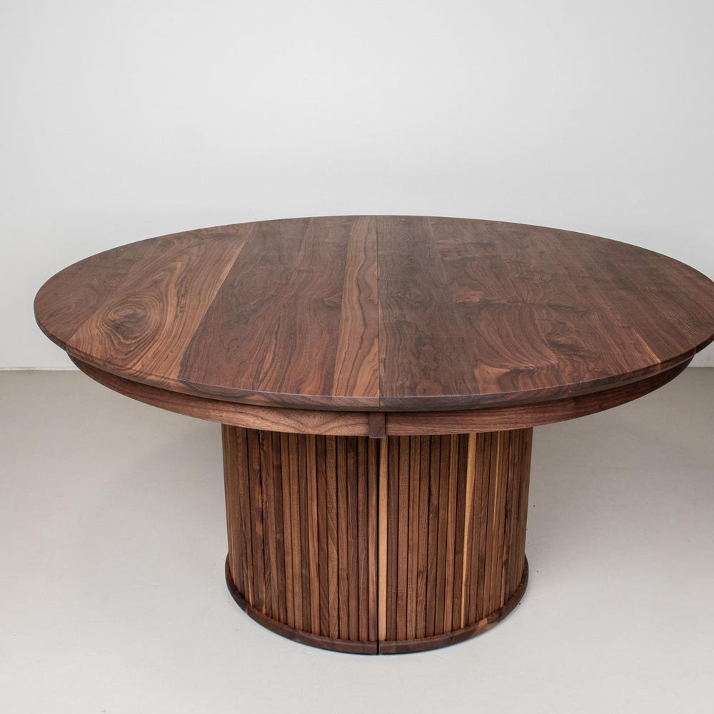 Dine in style at this round dining table with a leaf. Made of walnut, it is elegant both at its everyday round size and when extended. We build every table to order so there are many ways to make this table perfect for you.