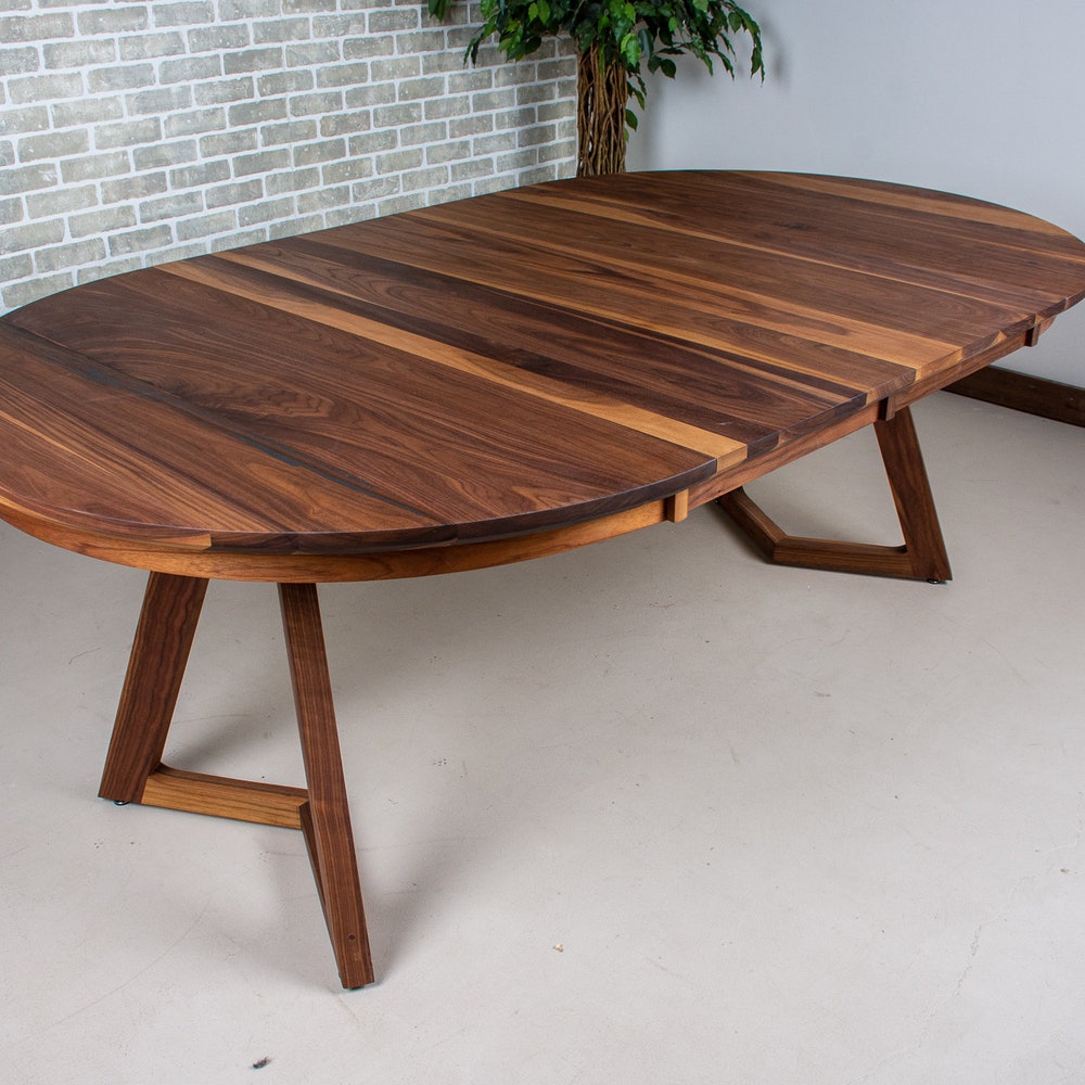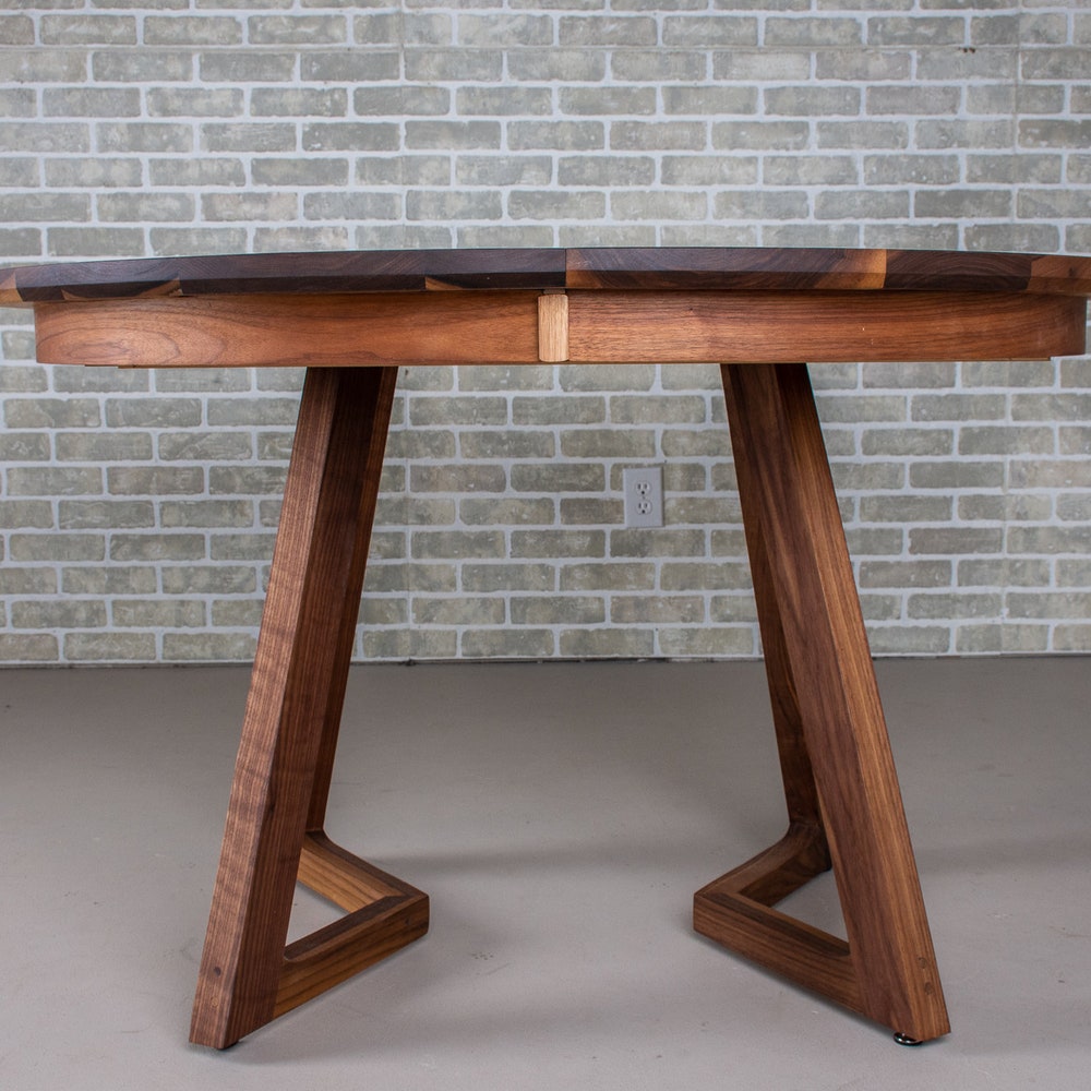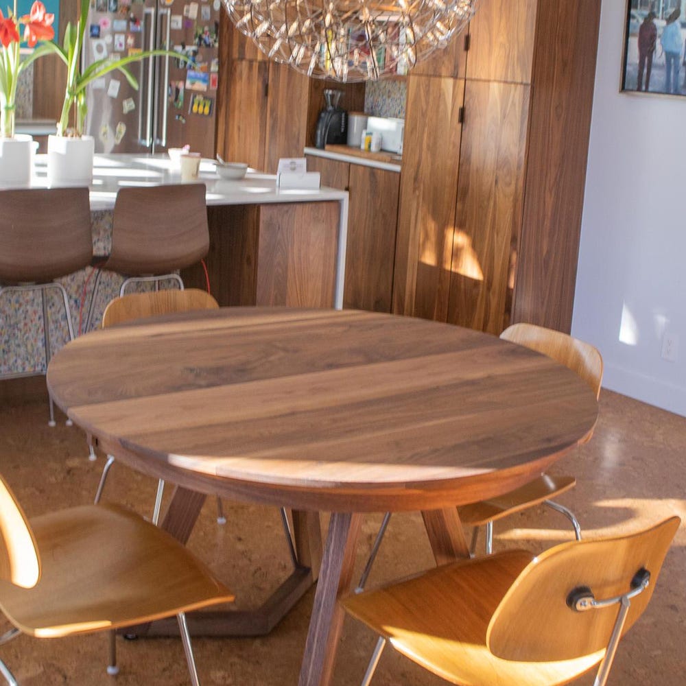 A round extending dining table is ideal for a kitchen or other high traffic space. On a daily basis, it is easy to walk around and it can quickly be extended using the 2 leaves that add to the center of the table to provide additional seating. We build every table to order so there are many ways to make this table perfect for you.