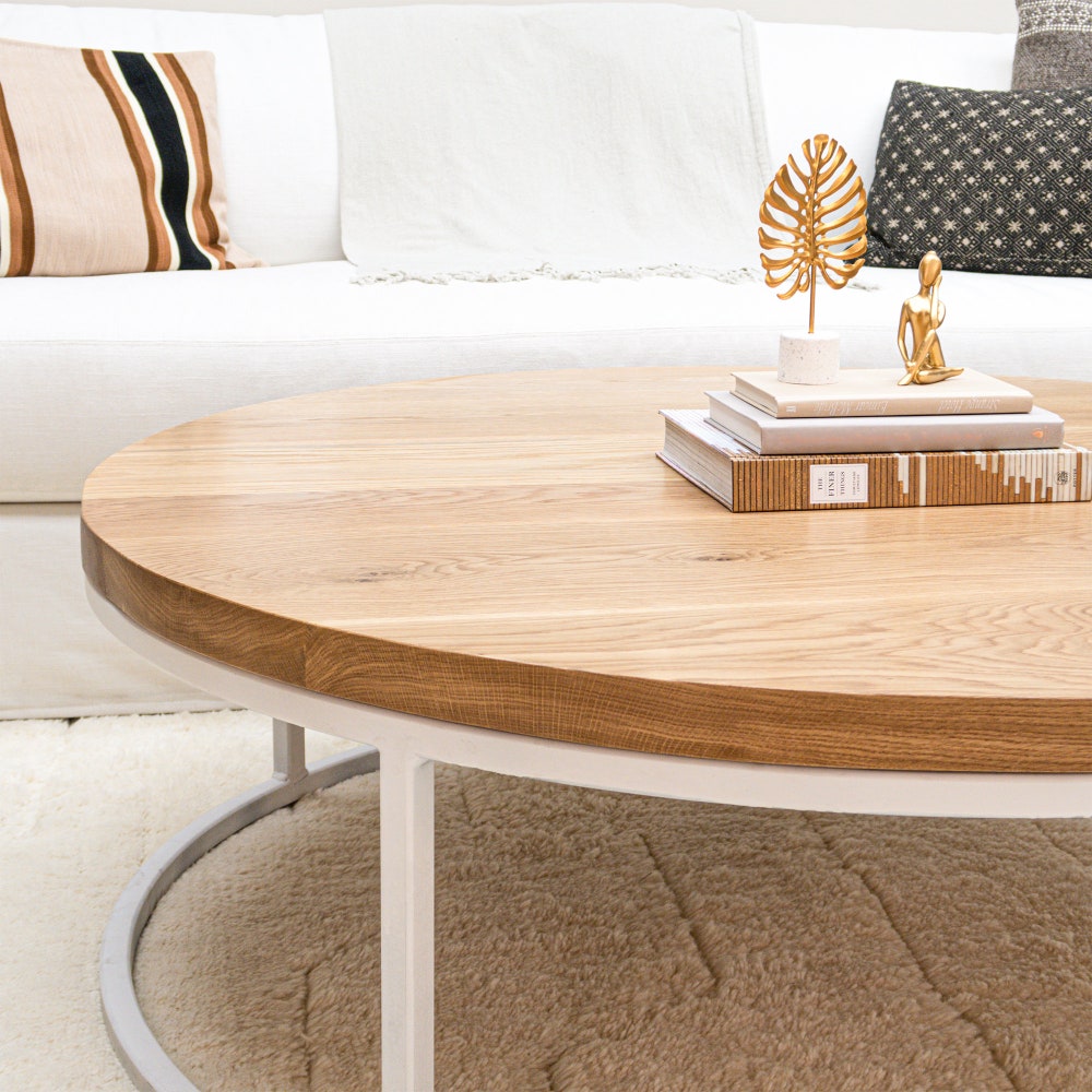 Our coffee tables are made in the USA of solid natural white oak hardwood. Natural white oak has one of the most beautiful grain patterns and is one of the most desired wood species. Due to the natural wood grain, your coffee table will be one of a kind as there is no other alike.