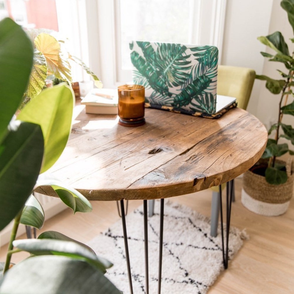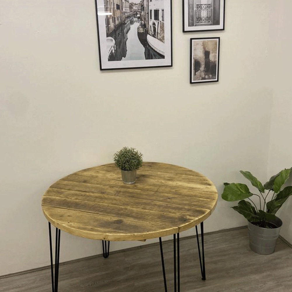 Modern rustic round dining table. our Alfie table is made from locally sourced reclaimed solid pine wood. Combining the warmth and individual character of a rustic tabletop with the sleek, sturdy appeal of powder coated industrial legs creates a balanced and versatile piece. Handmade to order.