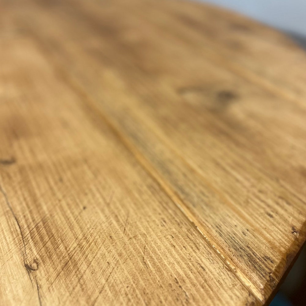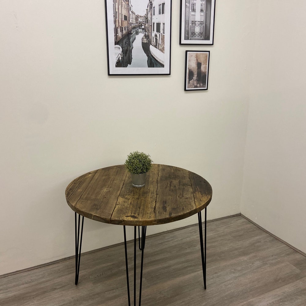 Pictures of the example pieces may slightly vary, as each piece of reclaimed wood is different and reacts differently to stains/oils. The time of the year also has an effect on the woods natural colour too. The finish in the first picture is the Amber stain and the table is 120cm in diameter.