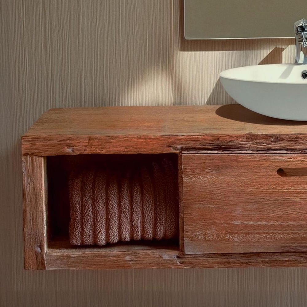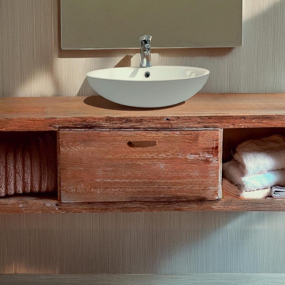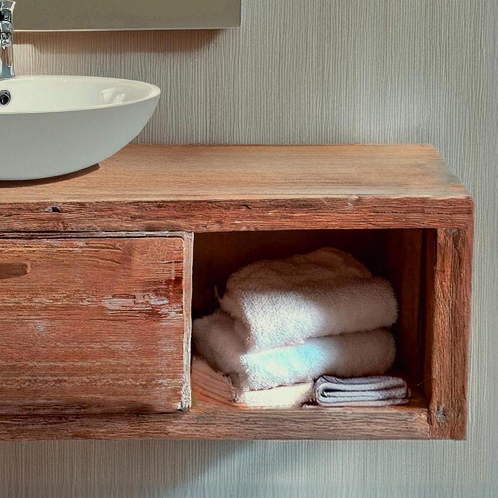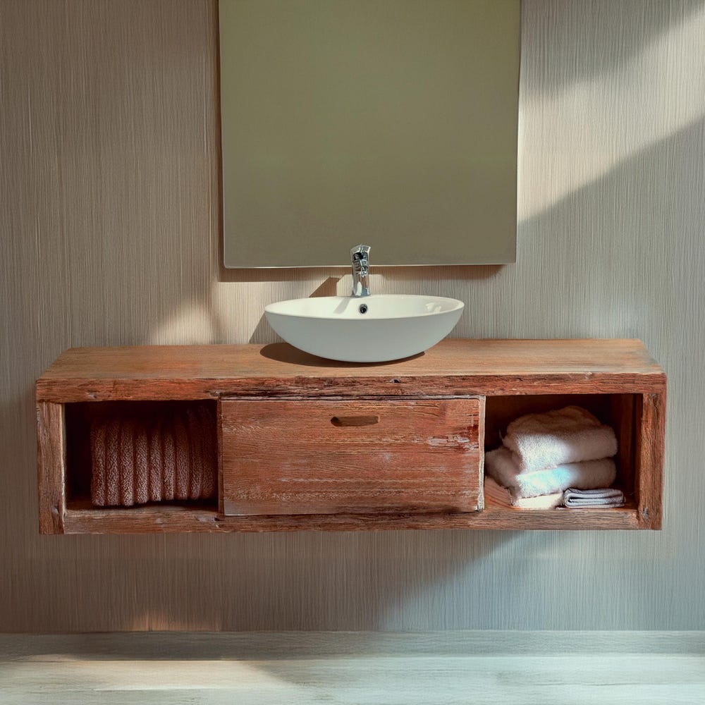 rustic handmade custom wooden floating bathroom vanity old style farmhouse decor sink table live edge reclaimed solid wood shelf countertop