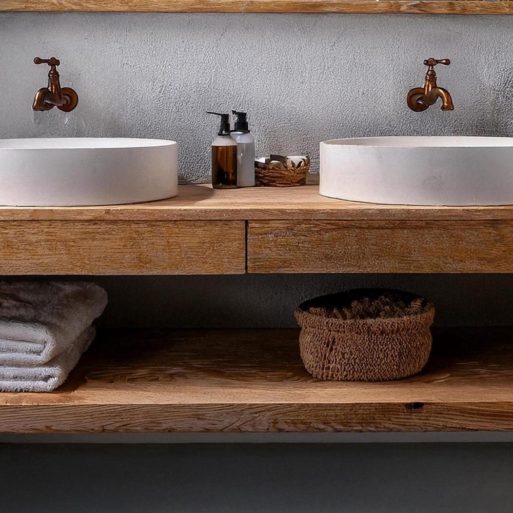 rustic handmade custom wooden double shelf floating bathroom vanity old style farmhouse decor sink table live edge reclaimed solid wood