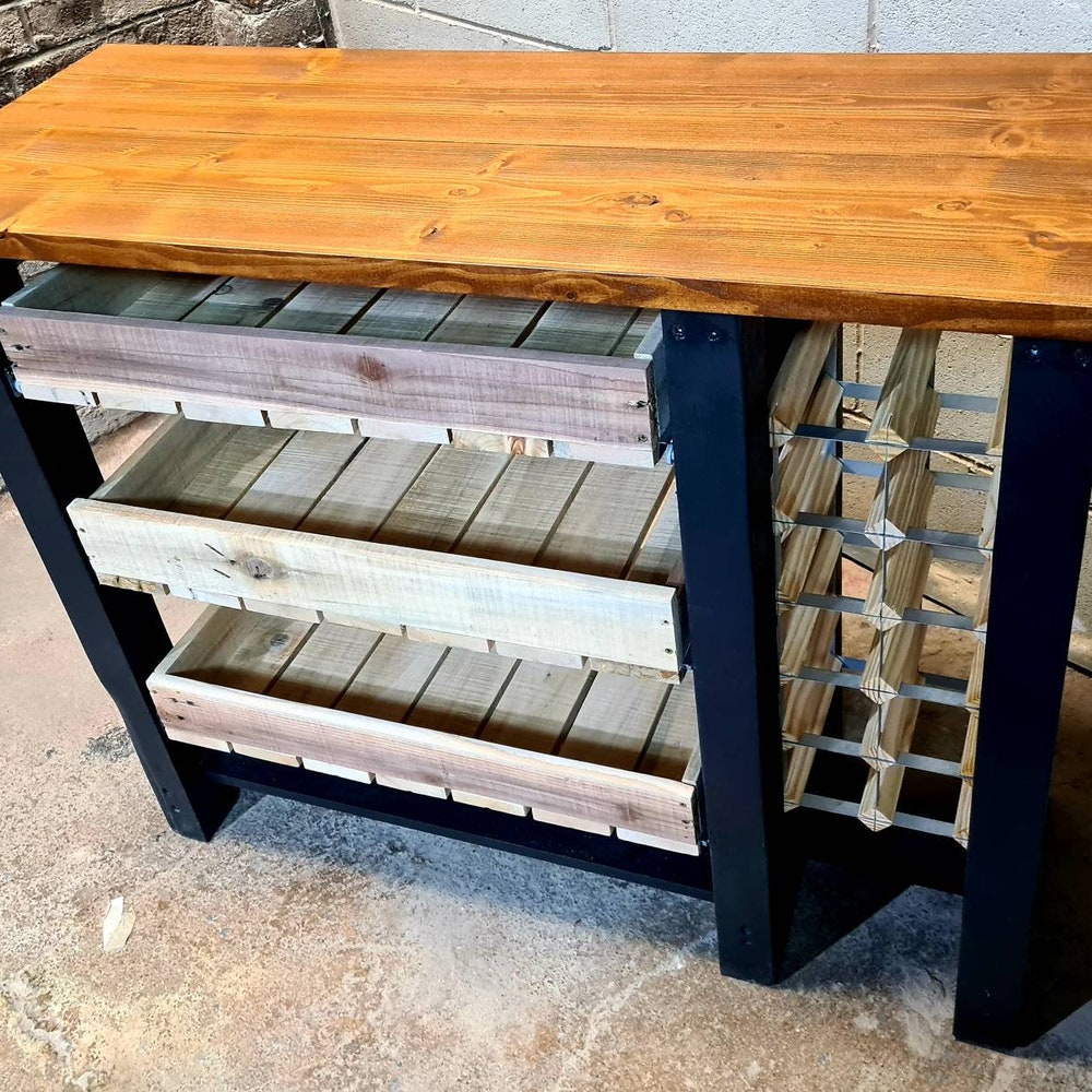 This beautiful console table features 3 drawers made of reclaimed pallet wood, a reclaimed scaffold top finished with osmo Amber oil, and has a 16 slots wine rack.