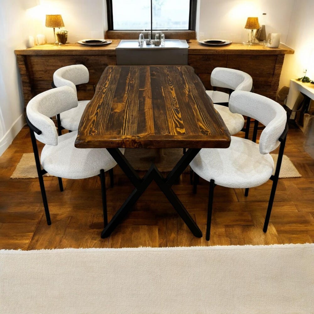 Designed with both style and practicality in mind, the metal X-legs offer superior stability and a modern industrial contrast to the warm pine wood top. Its versatile size makes it ideal for both compact kitchens and spacious dining rooms.
