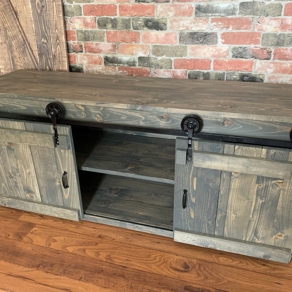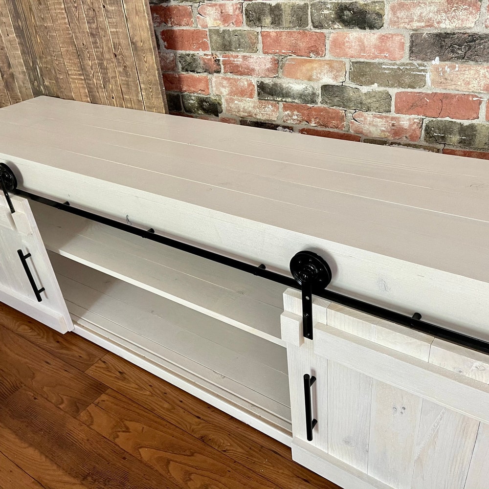 Sliding Barn Doors and metal wheels give this TV Stand its rustic farmhouse appeal.