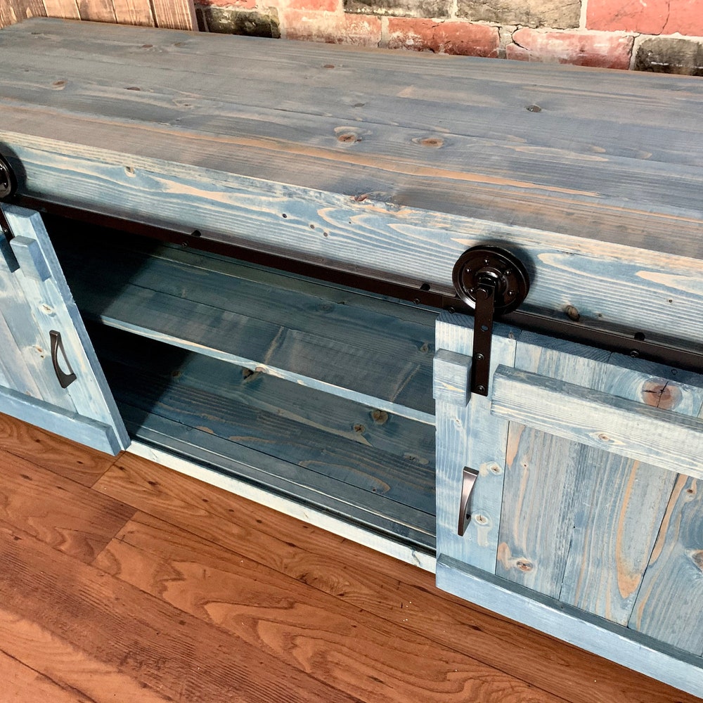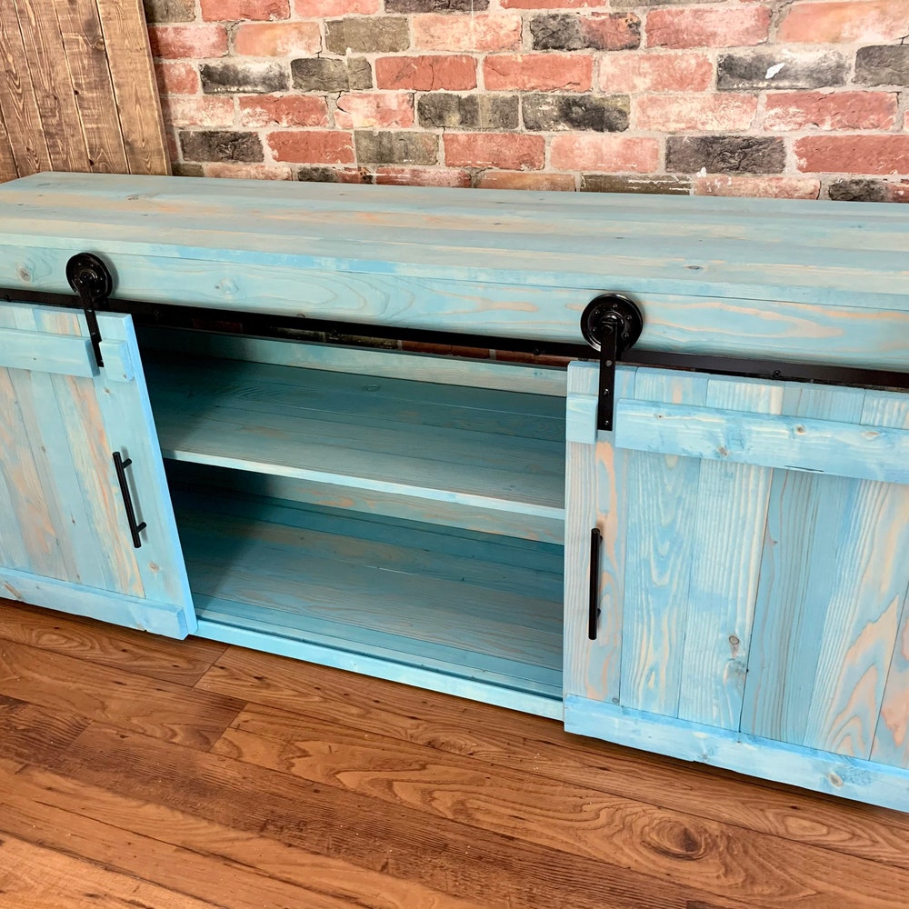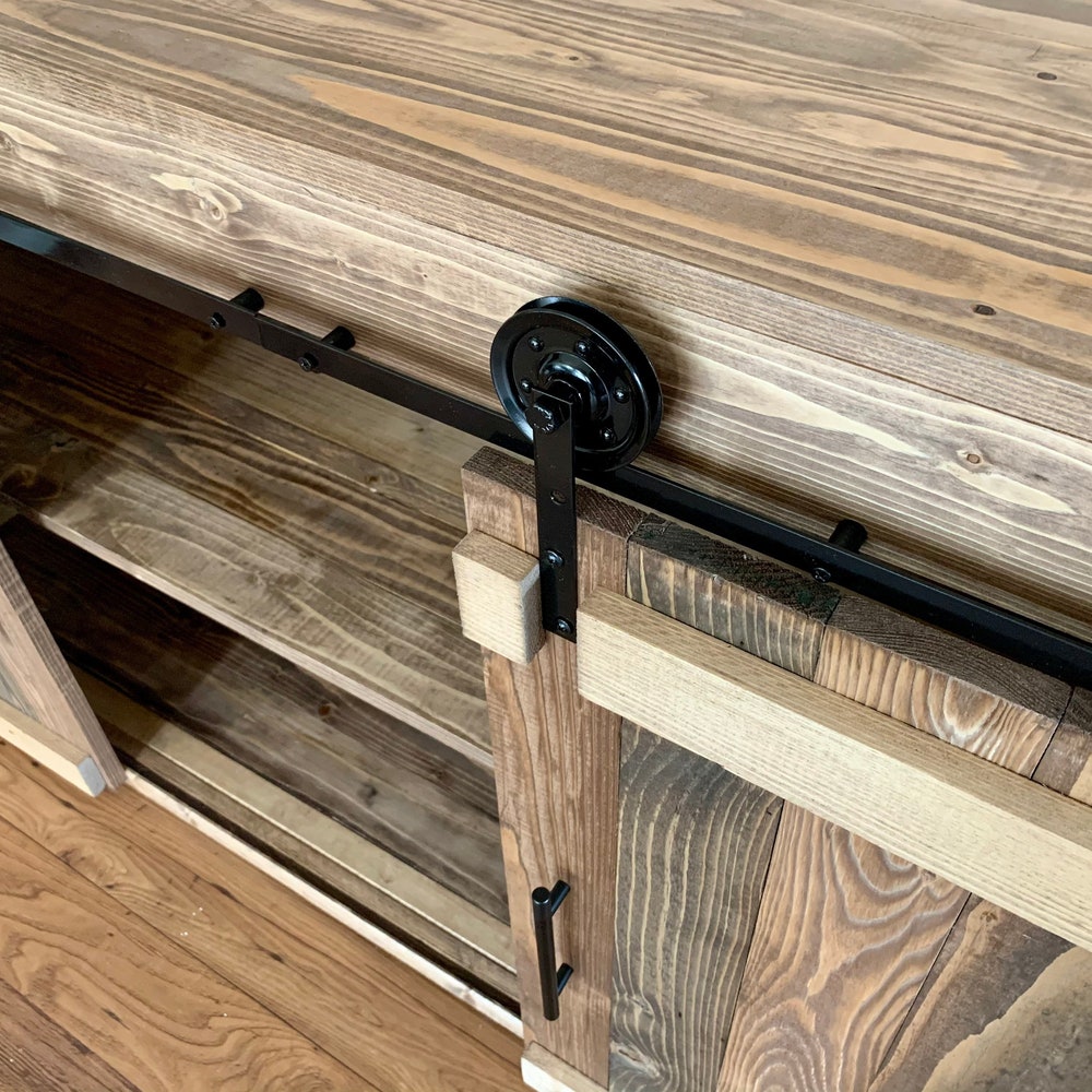 Sliding Barn Doors and metal wheels give this TV Stand its rustic farmhouse appeal.