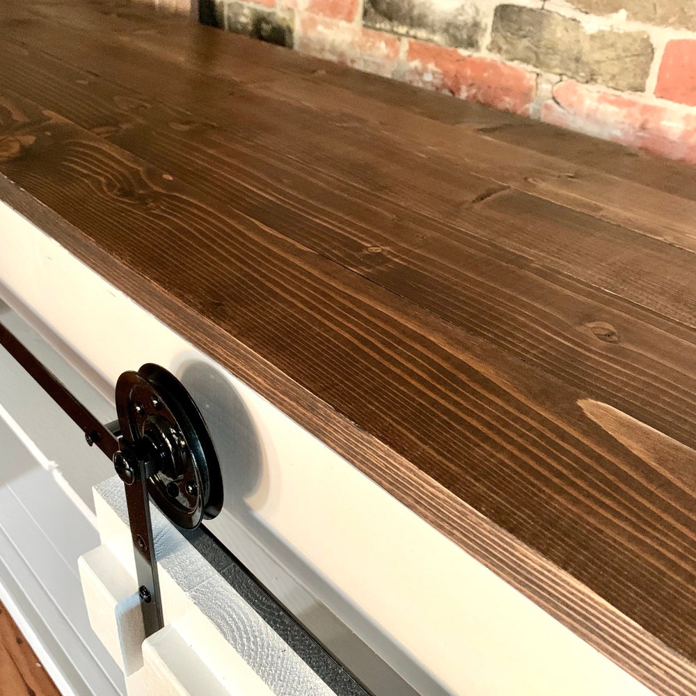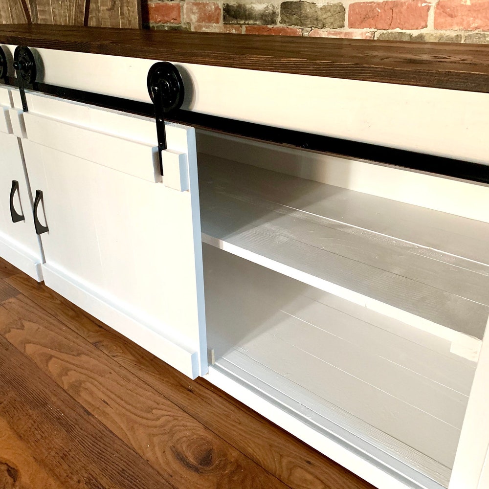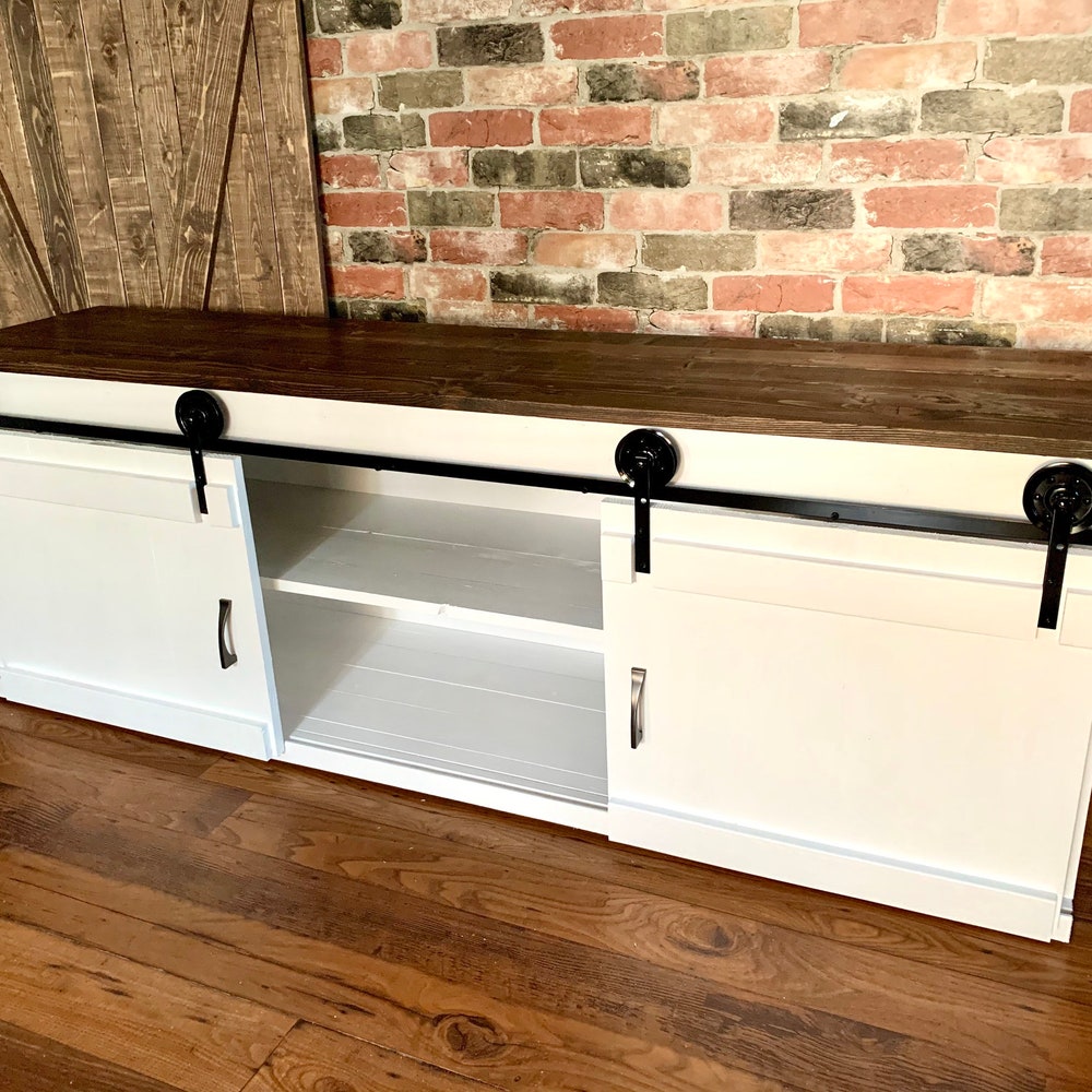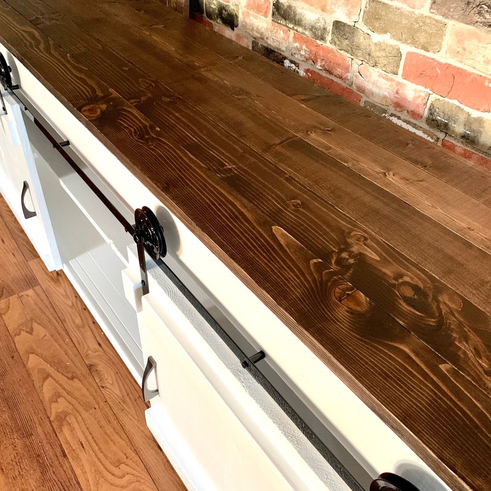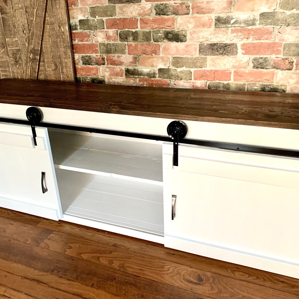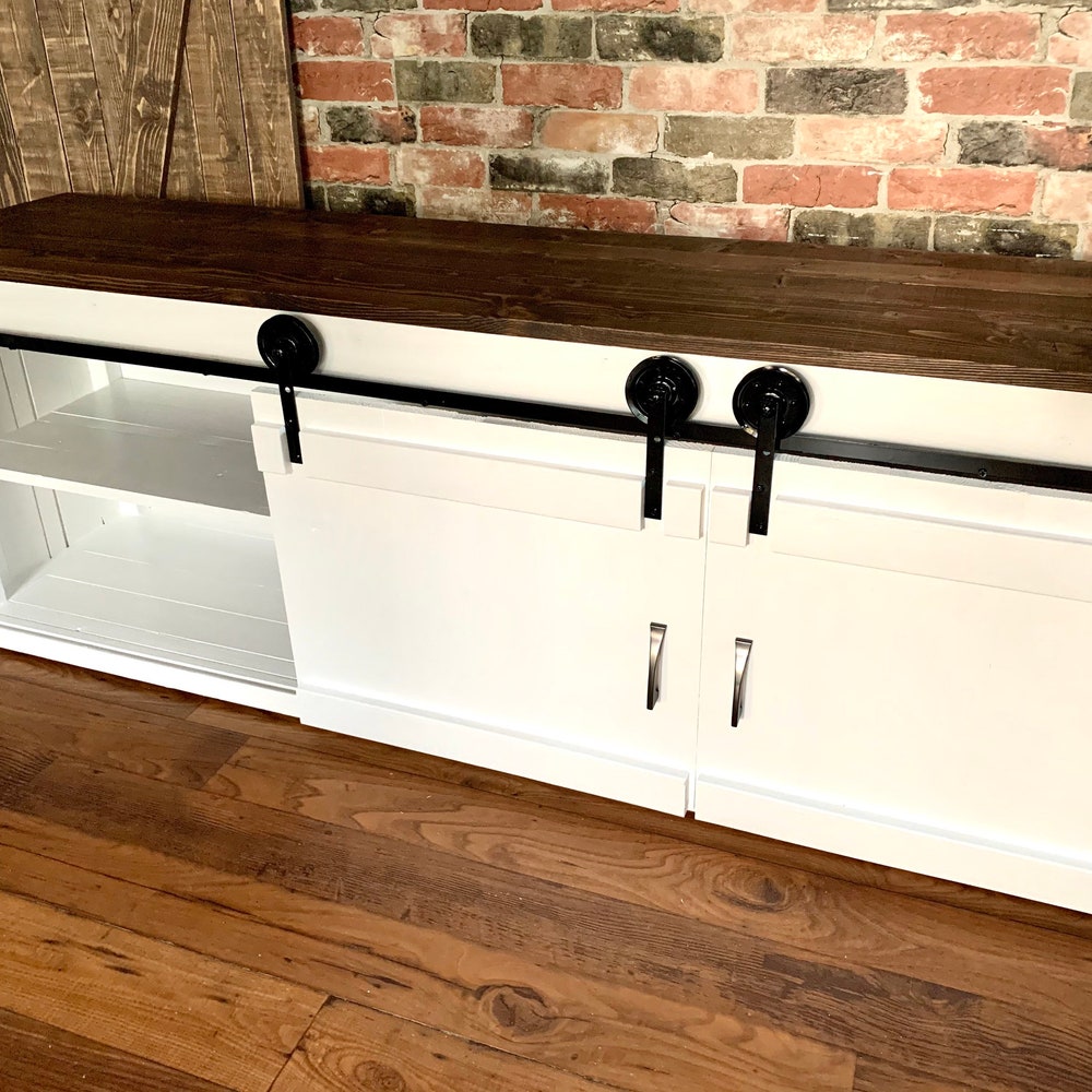 Sliding Barn Doors and metal wheels give this TV Stand its rustic farmhouse appeal.