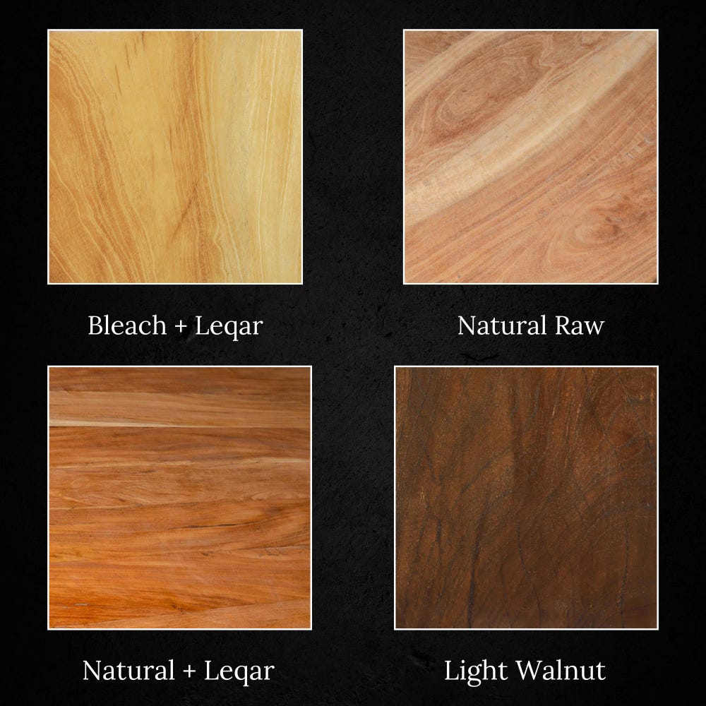 | Finishes | Bleach + Leqar, Natural Raw, Natural + Leqar, Light Walnut, Dark Walnut, Rustic Black, Rustic white, Rustic grey |