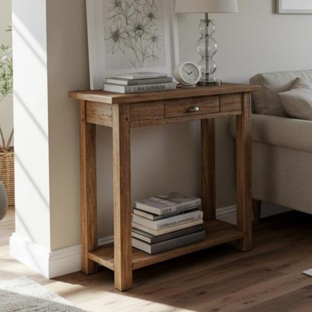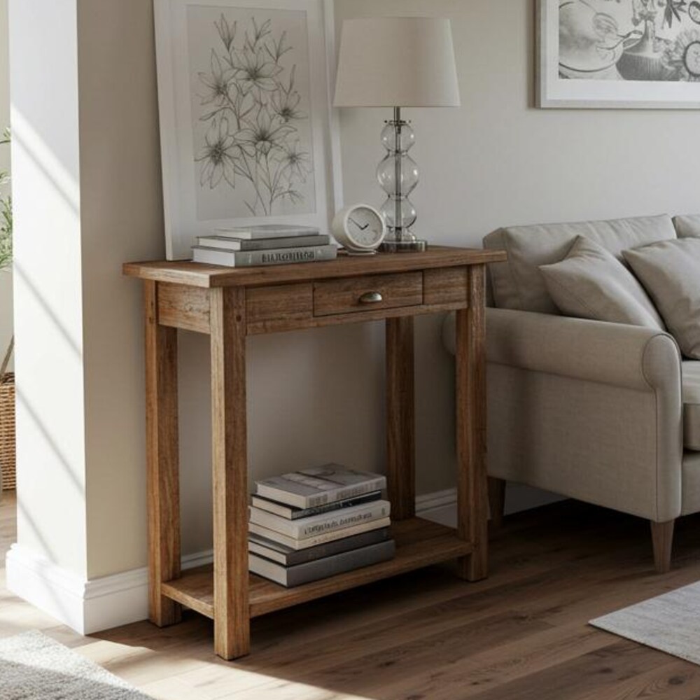 This rustic console table brings farmhouse charm to any entryway or hallway. Handcrafted from reclaimed wood with natural character and unique grain patterns that tell a story. The practical drawer provides hidden storage for keys and small items.