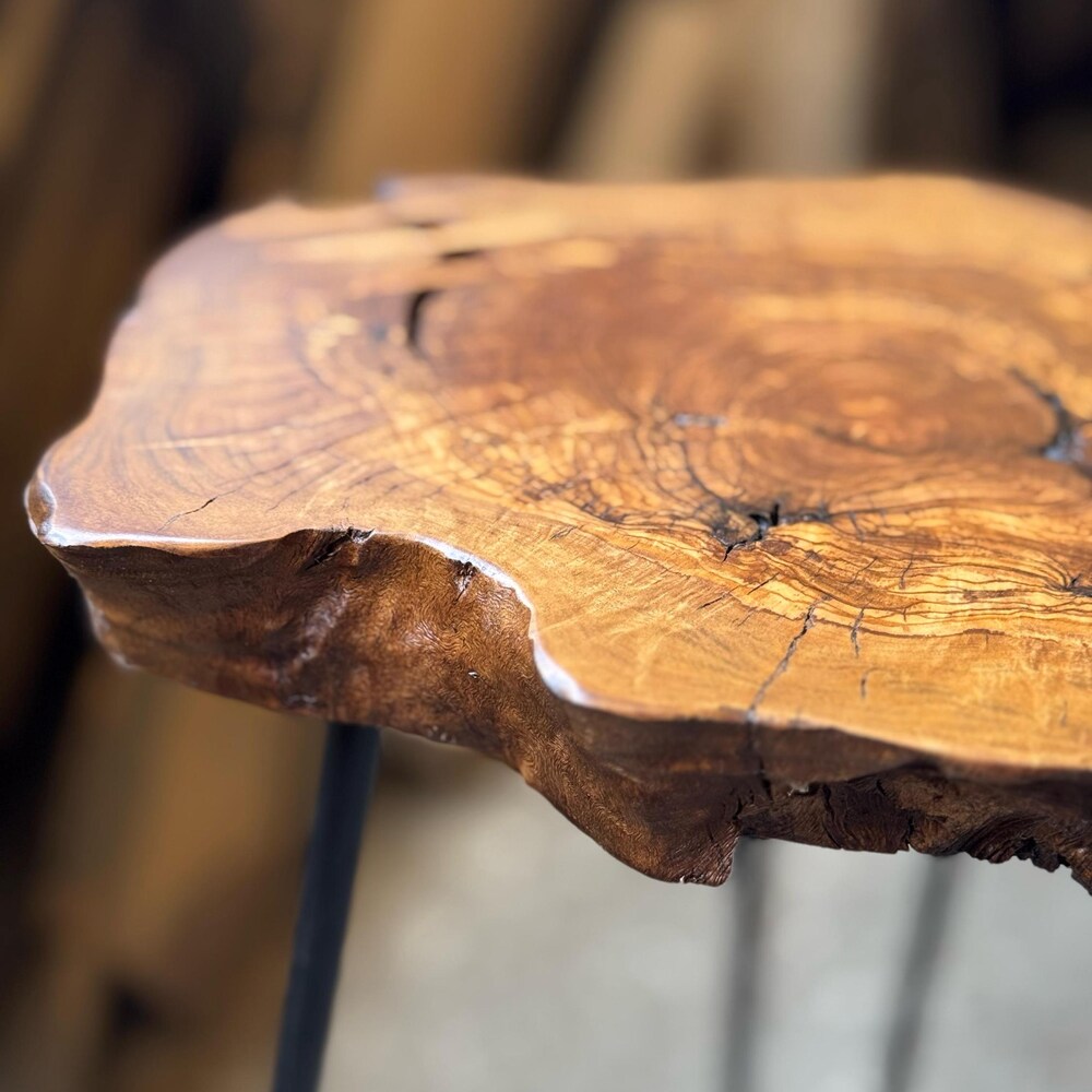 Bring a touch of nature into your living space with this handcrafted rustic root wood coffee table. Each table is uniquely made from live edge olive wood, showcasing the natural beauty and intricate grain patterns of the tree. The sturdy metal legs provide a modern contrast, ensuring durability and style.​