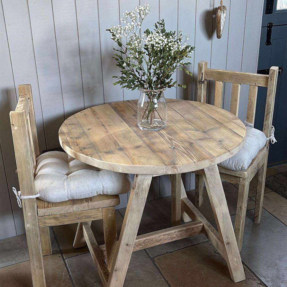 The Cobbett is a handmade rustic solid reclaimed wood round table full of rustic individual charm. This solid wood table can be a stunning focal point in any dining area, combining the natural beauty and durability of reclaimed pine with a timeless design and Scandinavian rustic and farmhouse feel.