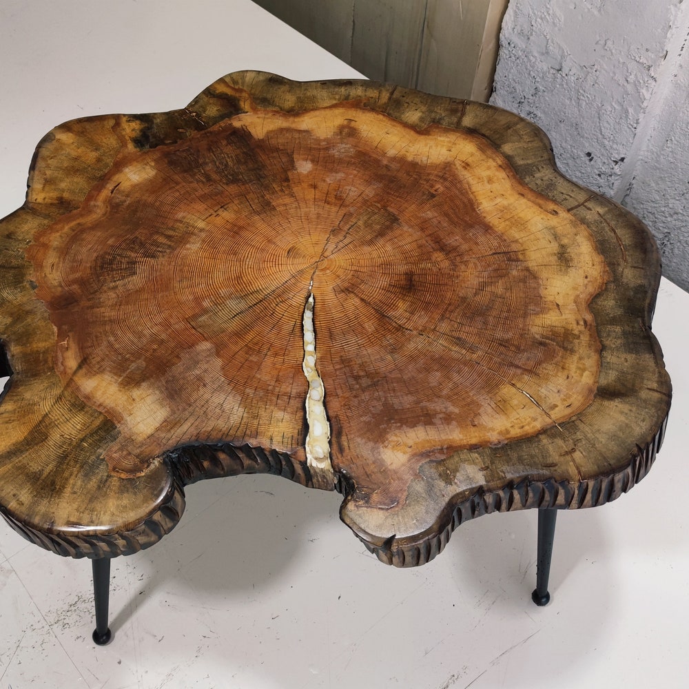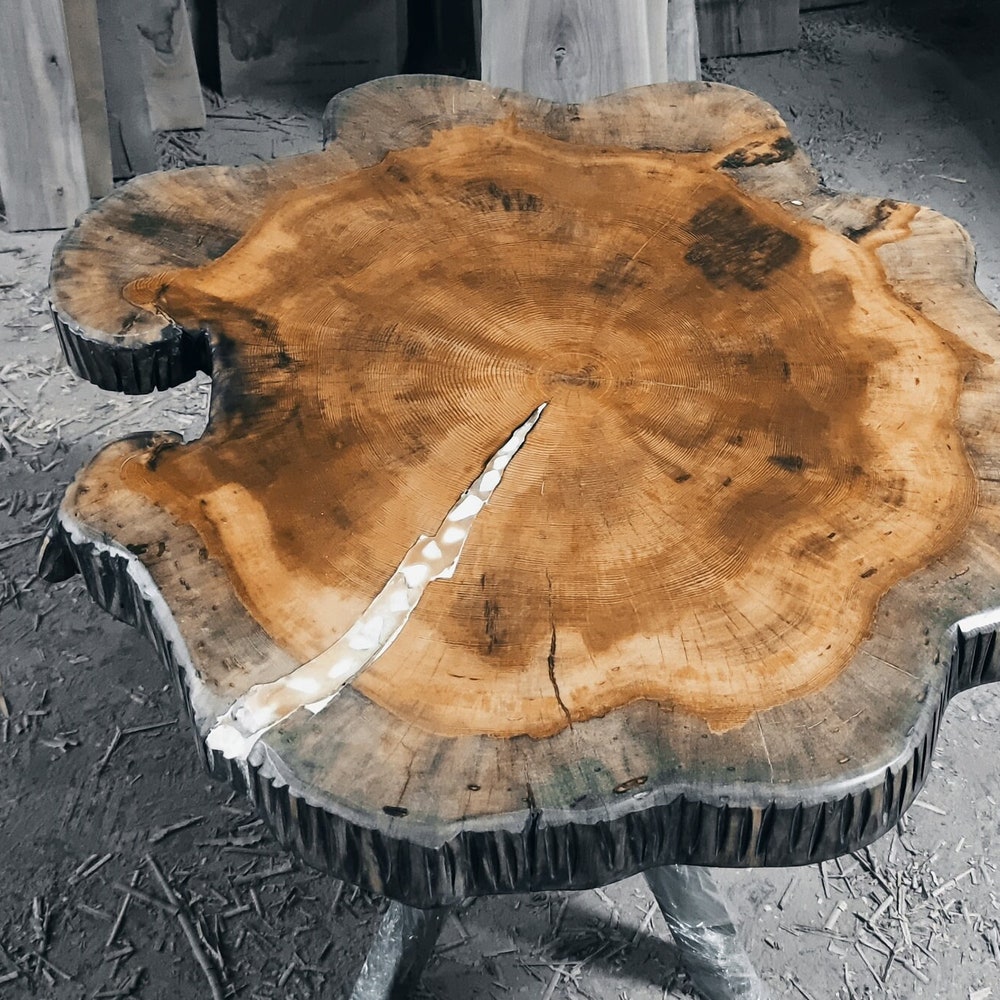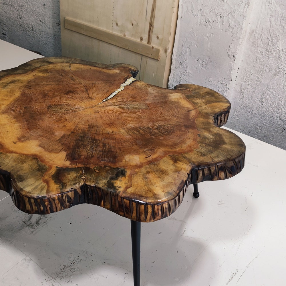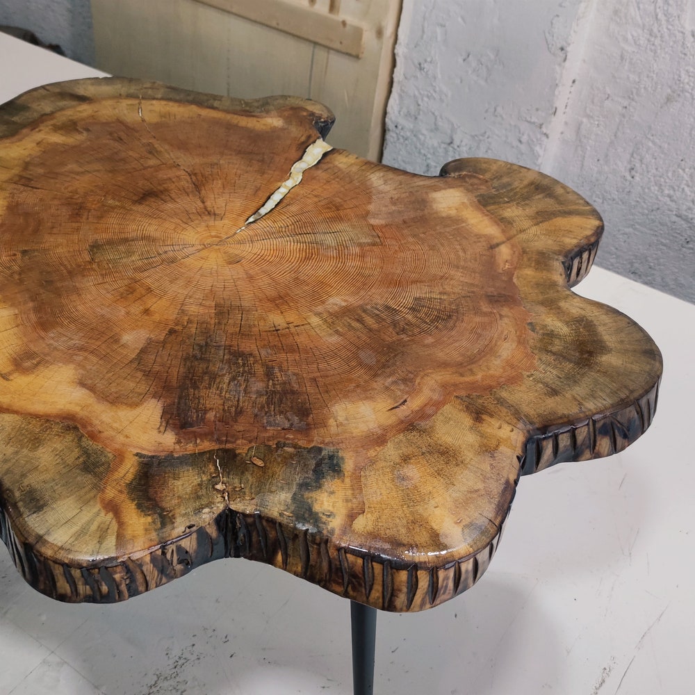 Live edge table is between 39-33 inches (100-85cm) in diameter. (Metal Foot Height is custom-made)